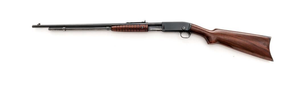 Remington Model 25 Slide-Action Rifle, #12674, .25-20 cal., 24" round barrel with 3/4-length magazine, factory dovetailed steel bead blade front and semi-buckhorn rear sights, blue finish, smooth wood two-piece straight grip buttstock, with ribbed forend and smooth steel crescent buttplate. Mfg'd 1924. Rifle is in very goos overall condition retaining approx. 90%-92% factory finish, with light scratches and general thinning of finish. Stock is very good with scratches and mars consistent with field use. There are a couple of small chips and a half-inch lateral crack behind the trigger guard. Action functions smoothly bore is good. Est.: $600-$800. (C&R)