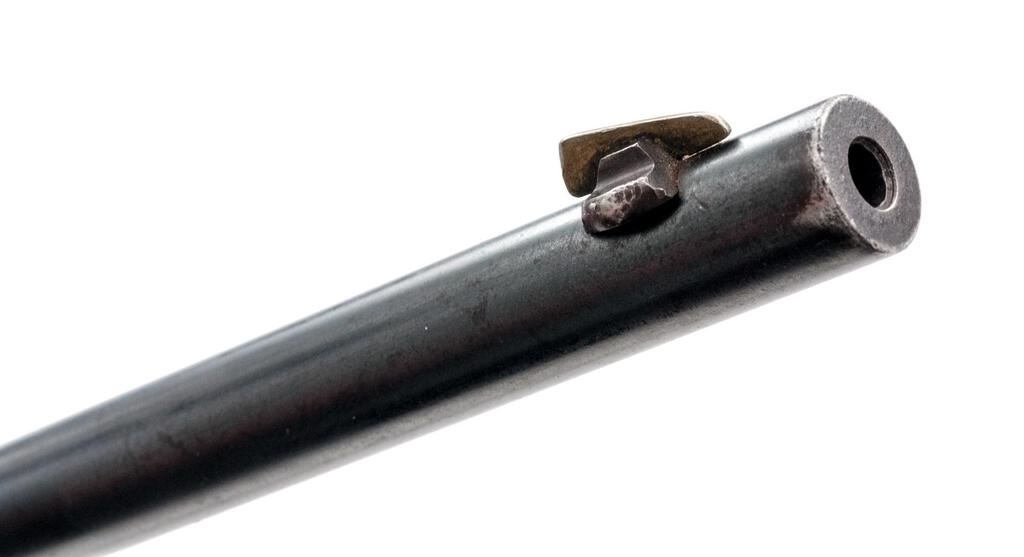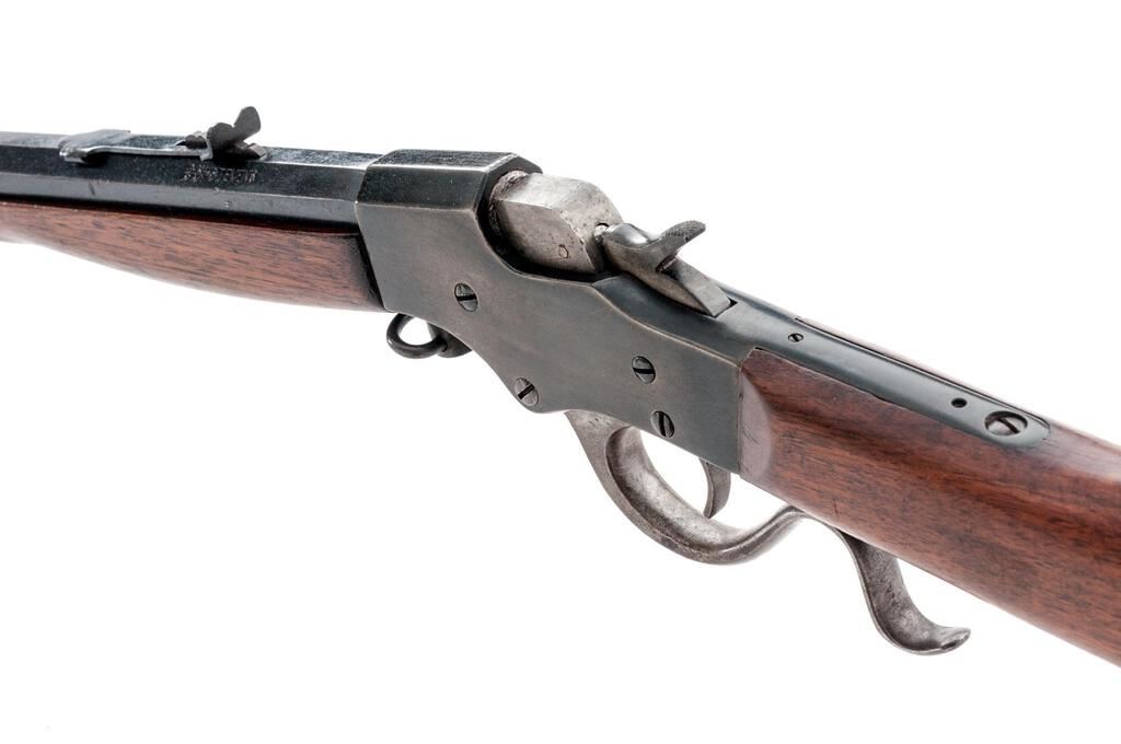 J. Stevens Favorite No. 17 Single Shot Falling Block Rifle, #M86, .25 RF cal., 22" octagon-to-round barrel, factory dovetailed Rocky Mountain front and standard elevator rear sights, blue finish, two-piece smooth wood straight grip stock with a checkered hard rubber Stevens marked buttplate, muted case colors on the breechblock and lever assembly, takedown. Rifle is in fine overall condition retaining a significant amount of toning original finish with the remainder going to gray patina, showing light scratches and sharp edges. Stock is good with light mars and a replacement screw in the buttplate. Action locks up tightly; bore is fair with light roughness and may well clean to good. Est.: $200-$300. (C&R)