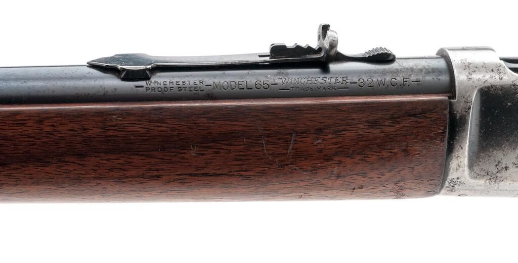 Winchester Model 65 Lever Action Rifle, .32 WCF cal., #1006860, 22" round barrel, steel bead factory dovetailed blade front and semi-buckhorn rear sights, blue finish, smooth walnut two-piece pistol grip stock, button magazine. Mfg'd 1941. Rifle is in very good overall condition. Barrel and button magazine retain approx. 80%-85% thinning factory blue with scratches and wear at the muzzle consistent with field use. Receiver retains 40%-50% thinning finish going to gray patina with considerable blue on both top and bottom tangs, the bolt and loading gate. There are Winchester "WP" proofs on the barrel and front ring. Stock is very good with small mars and handling marks. Wood-to-metal fit is very good. Buttstock ends with a widow's peak checkered steel buttplate providing a 13" LOP. Action is crisp, bore is good with sharp rifling. The Model 65 was a design evolution of the Model 53 with a total production of only 5,700 rifles produced. Est.: $1,000-$1,200. (C&R)