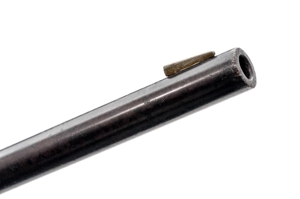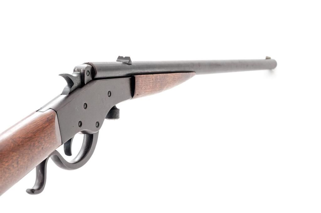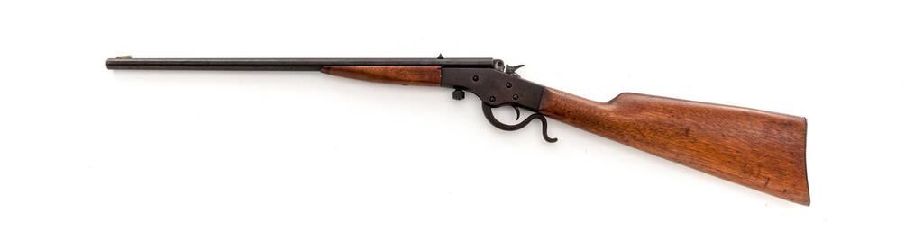 J. Stevens Crack Shot-26 Single Shot Falling Block Takedown Rifle, NSNV, .32 Long RF cal., 18" round barrel, German silver knife blade front and "V"-notched fixed rear sights, blue finish, thumb-screw takedown, smooth wood two-piece straight grip stock. Mfg'd from 1913-1939. Rifle is in good overall condition with the metal surfaces having gone to a dark brown patina, showing roughness at the muzzle and areas of light surface erosion evident along the barrel. Stock is in good condition with dents and mars consistent with field use. There is a small chip at the left rear of the hand guard, and there is a crude repair on the right side of the buttstock. Action locks up tight, bore is fair with some roughness and light pitting. Est.: $200-$400. (C&R)