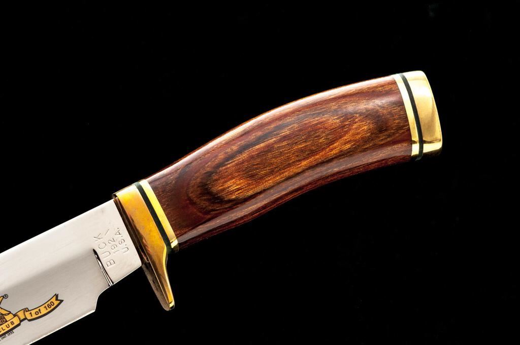 Scarce Limited Edition 1994 Buck Collectors Club Model 192 Vanguard Fixed Blade Knife, 4-1/8" mirror-polished drop-point blade with gold etched Buck Collectors logo, numbered 15/160. Brass single hilt and pommel with laminated wood handle. In clamshell case with COA. In excellent condition, with slight scratches and handling marks to the mirror polished blade. Est.: $150-$250.