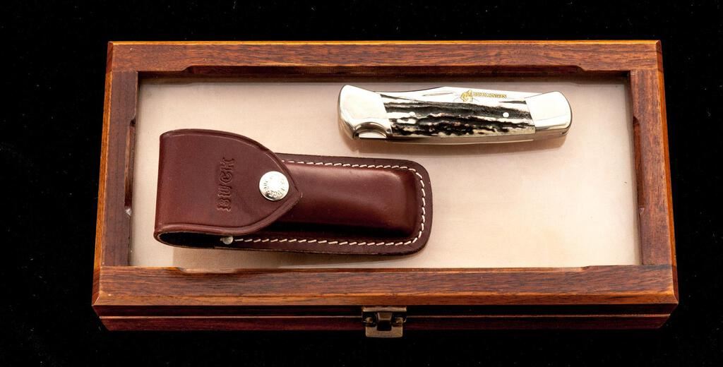 25th Anniversary (1961-1986) Buck Model 110 Folding Hunter, #0016, 3-3/4" etched blade with 25th Anniversary commemorative markings, 5" OAC, sambar stag handle, with nickel silver bolsters. Made in El Cajon Custom Shop. With brown leather Buck sheath. In glass-topped wood display case. Blade is like new. Bolsters with general light scuffs and scratches. Stag handles and sheath are excellent. There are some typical shallow storage type marks to the exterior of the display case. Est.: $100-$200.