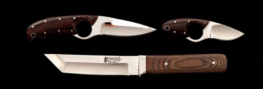 Lot of Three (3) Custom Fixed Blade Knives, by Alan Schrock and Bob Salpas: 1.) Ring Dagger, by Alan Schrock, 3-1/4" double-edged blade, 7" overall, wood handles, with tan leather sheath. Sheath has a belt clip. Knife is in excellent overall condition, appearing unused. There is a little verdigris on the nickel silver pins. Sheath needs to be cleaned as it has patches of light mildew staining. 2.) Ring Knife, by Alan Schrock, 2" drop-point blade, 4-1/2" overall, wood handles, with tan leather sheath. Condition is near excellent with a few fine scratches on the blade. There is a little verdigris on the nickel silver pins. Sheath needs to be cleaned as it has patches of light mildew staining. 3.) Tanto, by Bob Salpas, 5-1/4" satin-finished blade, 9-3/4" overall, brown micarta handles with the original brown leather sheath. Condition is near excellent. There is mild surface rust along the protected area where the blade and bolster meet. Otherwise, the knife is like new. Sheath has a few light surface scuffs and scratches. Est.: $350-$500/Lot.