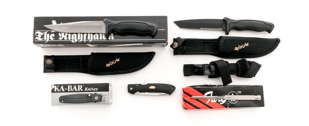 Lot of Five (5) Knives by Buck, Fury, Ka-Bar, and Beretta: 1.) Buck Model 650 The Nighthawk fixed blade knife with 6" bead blasted blade. Includes the original sheath and box. Mfg'd 1995. Knife is excellent, unused, with a few mild scuffs on the blade. 2.) Buck Model 653 Nighthawk with 5-1/2" black tanto blade, and the original sheath. Mfg'd 1997. Condition is near excellent. There are scattered light scuffs present on the matte finished blade. 3.) Beretta lockback folding knife with 3-3/4" serrated skeletonized blade. Made in Japan. Knife is excellent overall, appearing unused, with a few minor handling marks. 4.) Ka-Bar #4061 Dozier Thorn folding knife, 3" matte black blade, with original box and paperwork. Condition is near excellent, appearing unused. There are a few light scuffs and scratches present on the handle. Box shows some superficial damage to the edges and corners. 5.) Fury #60009 Three Angle Covert fixed blade knife, 3-1/4" blade, 7-1/8" overall, one-piece construction. With sheath and box. Knife is in excellent condition, showing only intermittent mild handling marks. Est.: $250-$400/Lot.