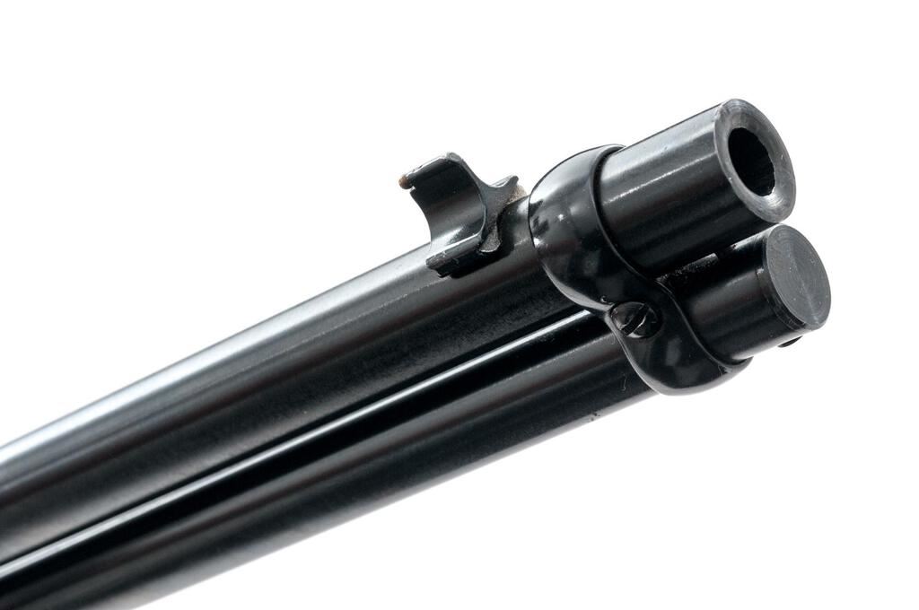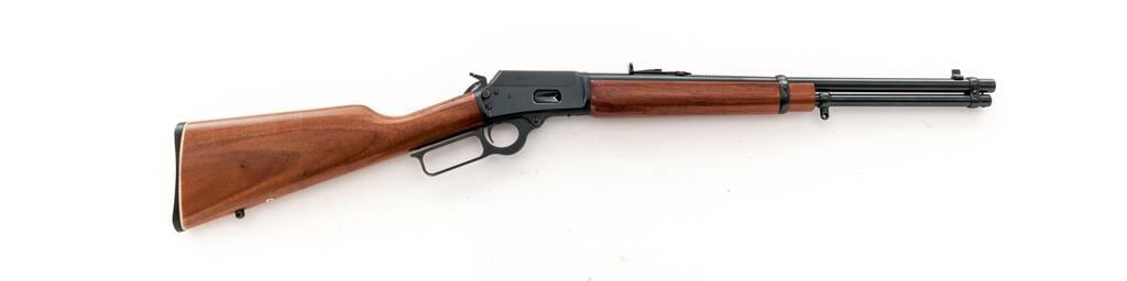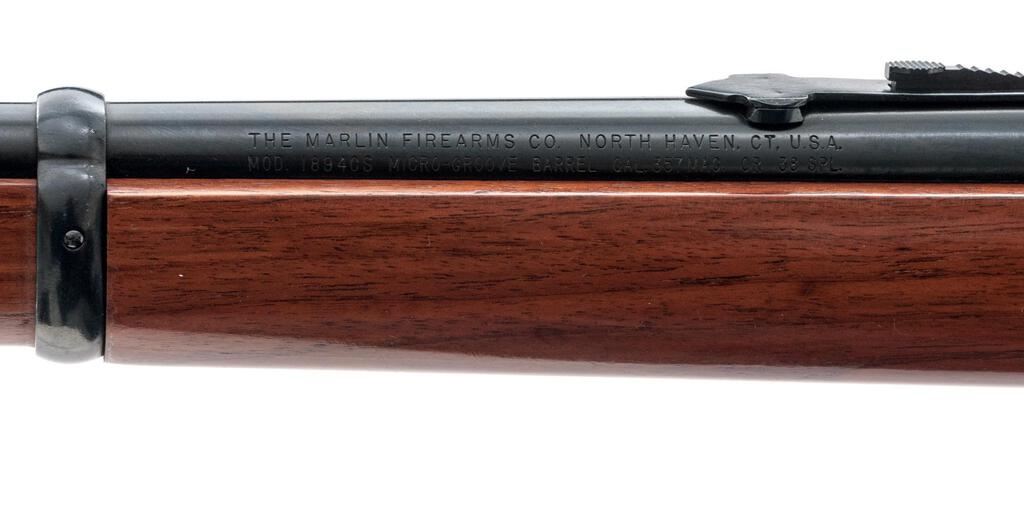 Marlin Model 1894 CS Lever Action Carbine, #11091635, .357 Mag./.38 Spec. cal., 18.5" micro-groove round barrel with full-length magazine, brass bead blade front and folding semi-buckhorn rear sights, blue finish, smooth wood two-piece straight grip stock with sling eyes and a checkered plastic Marlin marked buttplate. Mfg'd 1989. Carbine is in excellent overall condition retaining approx. 96%-97% factory blue finish with light handling marks. Markings are sharp with a nice "JM" on the barrel. Top of receiver is factory drilled and tapped with the tap screws retained. Smooth wood stock has a couple small mars and a half-inch compression on the right side at the tang. Action is crisp, bore is very good with sharp rifling. Popular with the Cowboy action shooters, these carbines were discontinued in 2015. Est.: $900-$1,200. (Modern)