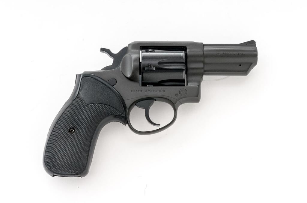Ruger Speed-Six Double Action Revolver, #155-65311, .38 Spec. cal., 3'' barrel, "tactical" gray finish on frame and barrel, blued cylinder, checkered black rubber Pachmayr ''Presentation'' grips, ramp front sight with square-notched rear sight. In near excellent condition with minor handing wear. Front edges of cylinder are discolored, possibly due to cleaning. Grips are excellent with only a small raised area on the left panel due to over tightening the grip screw. Smooth action, bright bore. Est.: $500-$700. (Modern/PPT)