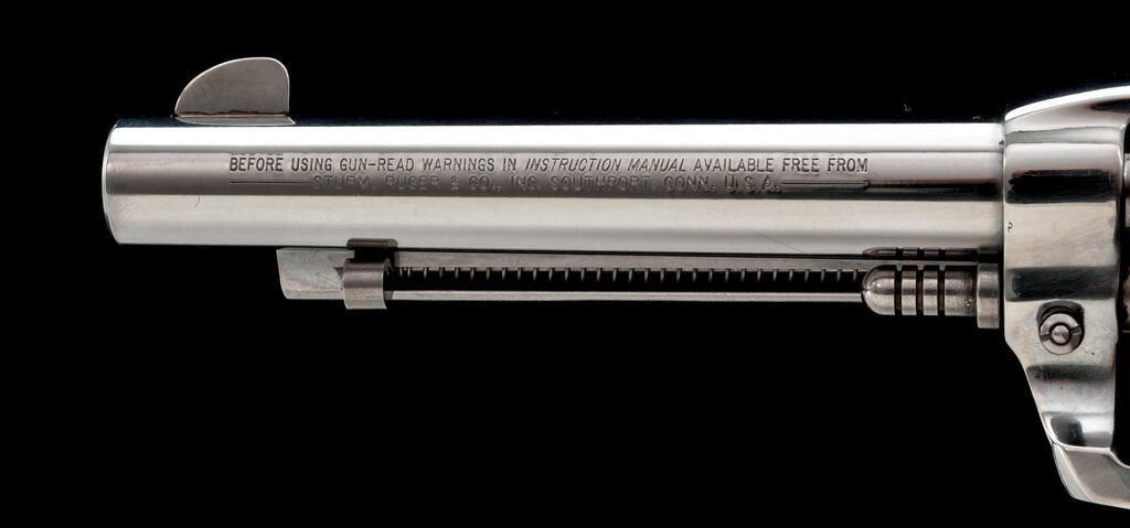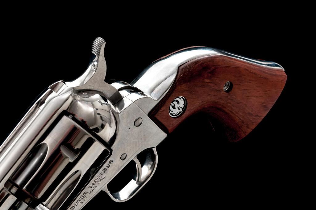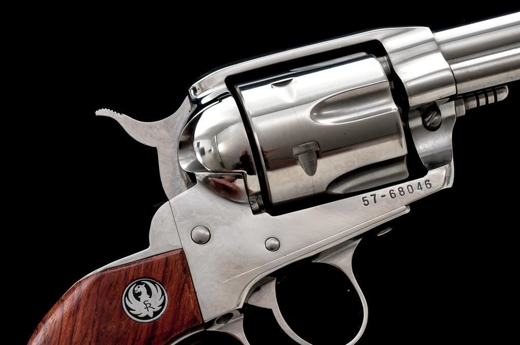 Ruger Vaquero Single Action Revolver, #57-68046, .357 mag. cal., 5.5'' barrel, high-gloss stainless finish, smooth hardwood grips with Ruger silver eagle medallions, and standard fixed sights. In original gray plastic case with matching numbered end label and gun lock. Condition is near excellent. Metal surfaces with light scratching and small handling marks, typical of high-gloss stainless finishes. Factory lettering is crisp. Grips show only minor use. Cylinder with a light index line; chambers are clean, cylinder face with normal powder burn marks. Crisp tight action, bright bore with excellent rifling. Est.: $700-$900. (Modern/Exempt)