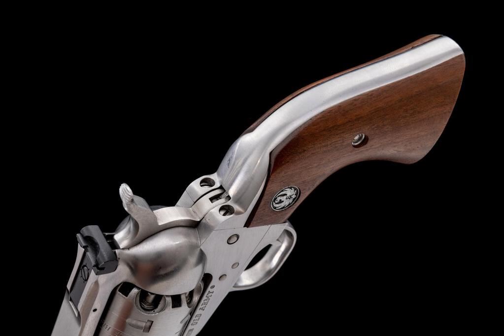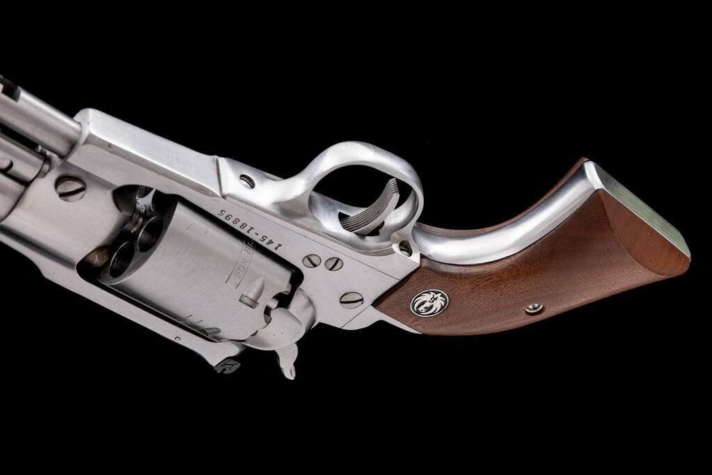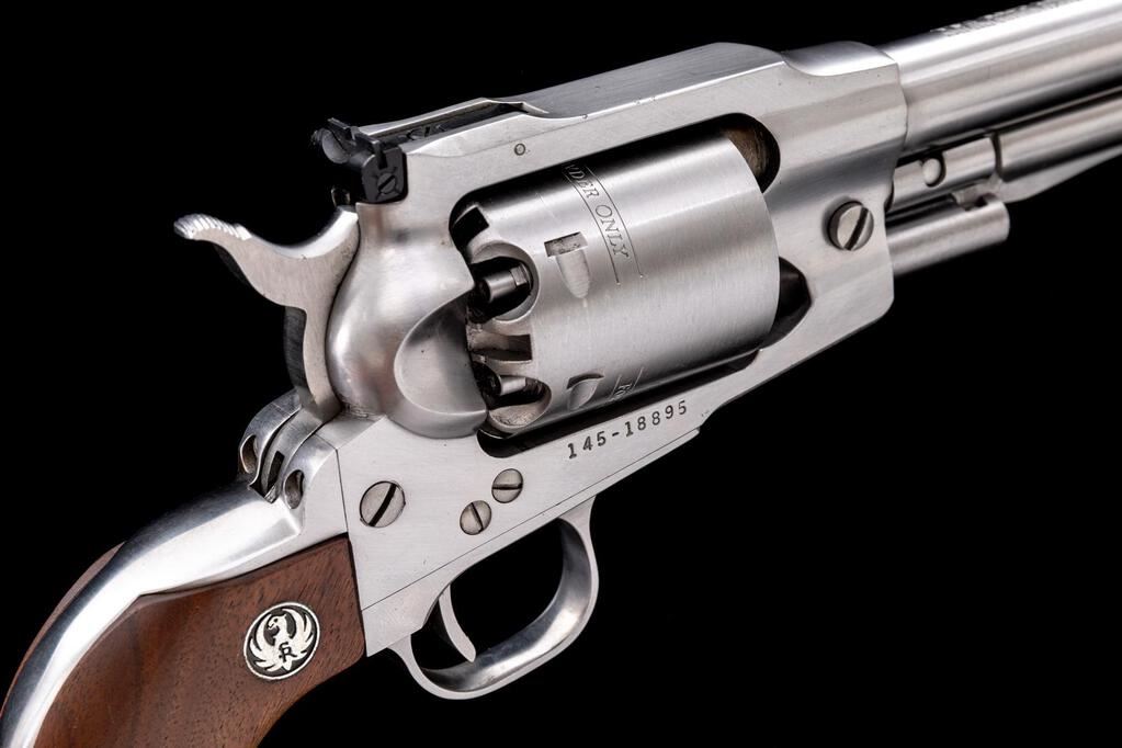 Ruger Old Army Single Action Percussion Black Powder Revolver, #145-18895, .45 cal., 7.5" barrel, ramped blade front and adjustable rear sights, stainless steel finish, smooth wood Ruger medallion two-piece grips, 6-rd. cylinder marked "Black Powder Only". Mfg'd 1982. Revolver is as new and appears to be unfired, with only light handling marks and scuffs. Smooth wood grips are excellent. Long out of production and desirable. Est.: $800-$1,000. (No FFL Required)