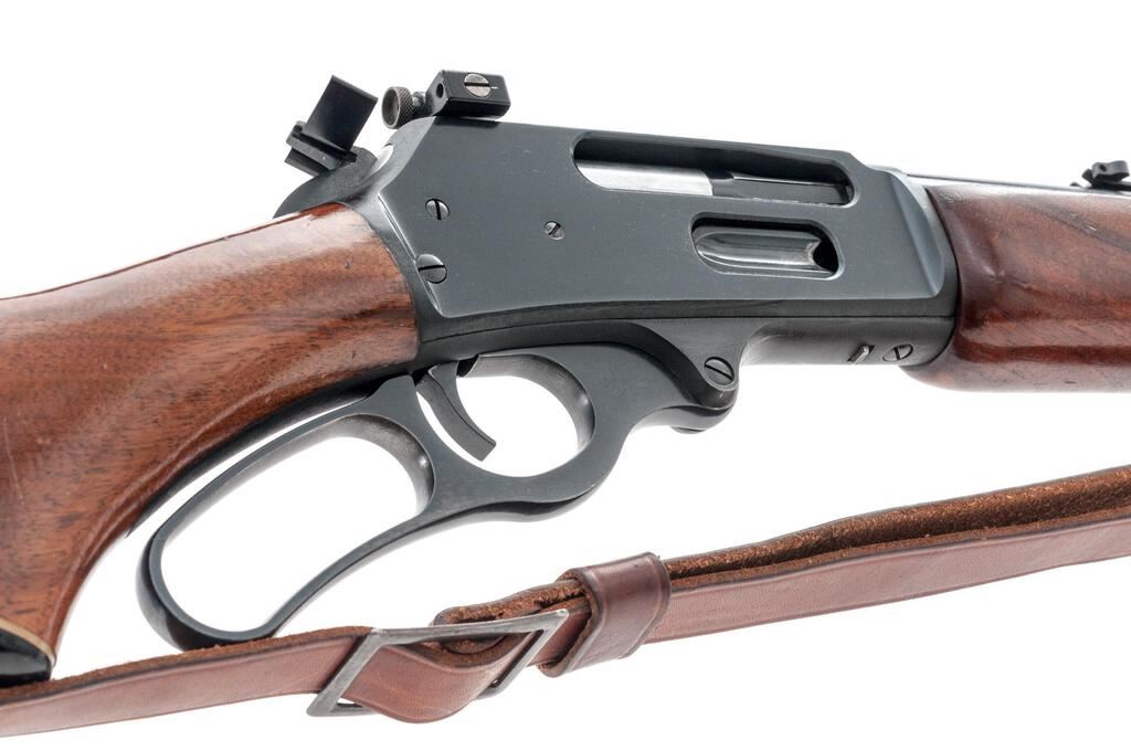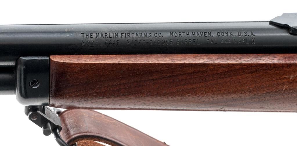 Marlin Model 444S Lever Action Rifle, #18051140, .444 Marlin cal., 22" barrel with micro-groove rifling, hooded blade front and folding buckhorn rear sights, half magazine, hammer extension, blue finish, smooth wood two-piece pistol grip stock, Williams aperture sight, sling swivels, and a period leather rifle sling. Mfg'd 1982. Rifle is in near fine overall condition retaining approx. 95% factory blue finish, with light scratches, handling marks and edgewear. Smooth wood stock is in good condition with mars and compressions consistent with field use. Stock ends with a Marlin marked solid rubber recoil pad providing a 13.75" LOP. Front sight has been colored red with fingernail polish, and a Williams peep sight has been added during the period of use. Missing inletted bullseye into rear bottom of stock. Action works well, bore is very good with sharp micro-groove rifling. Est.: $800-$1,000. (Modern)