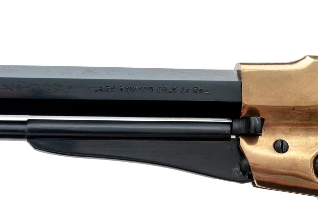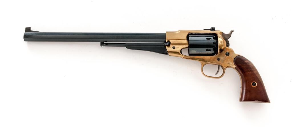 Reproduction Remington Model 1861 Army "Buntline" Percussion Revolver, by Pietta, with Color Pictorial Carton, #R296245, .44 cal., 12" octagonal barrel has maker's name, address, and proofs at right, "Black Powder Only 44 Cal." at left, tall front sight, hinged lever below; plain round 6-shot cylinder; brass solid frame has adjustable rear sight, proofs at right, matching trigger guard, integral straps with 2-pc. oil-finished walnut grips. Condition is new and unfired retaining all its deep black-blue to barrel, lever, and cylinder lightly-toned bright brass. Stocks show light handling, finish loss at backstrap. Action is crisp, bore shows full blue, sharp rifling. Matching-numbered box shows light wear, bright color graphics. Est.: $300-$500. (No FFL Required)