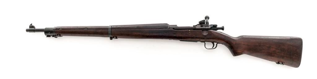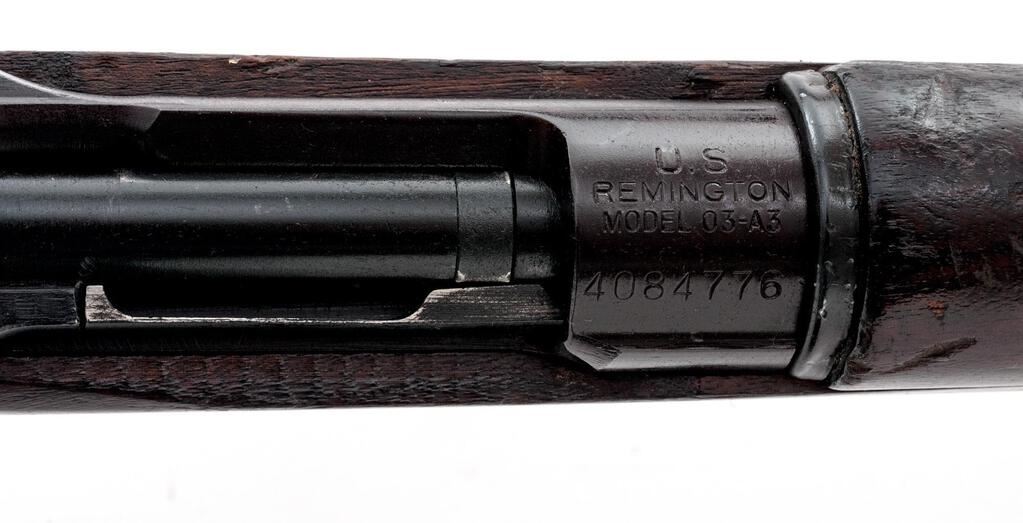 Remington Model 1903-A3 Bolt Action Rifle, #4084776, .30-06 cal., 24" barrel, blackened finish, walnut stock set, blade front sight and adjustable sliding aperture rear sight. Marked "U.S. REMINGTON MODEL 03-A3" on top of receiver ring. Barrel behind the front sight is marked "RA/(flaming bomb)9-43". The Scant stock is stamped "AA HO" on the left-side wrist, with a boxed "RIA/EB" on the left-side buttstock. There are two "P" firing proofs stamped into the underside of the wrist. Two mismatched numbers have been engraved into the top of the bolt handle and stamped into the right-side buttstock (partially removed). Rack #394 stamped into comb of buttstock. Condition overall is very good with the metal retaining approx. 90% finish. There are 4 spliced inserts to repair cracks to the top of the hand guard, otherwise the wood is very good showing old scratches and handling marks to the dark finish. Action operates smoothly, bright bore is excellent with excellent two-groove rifling. No visible import marks. Est.: $700-$900. (C&R)