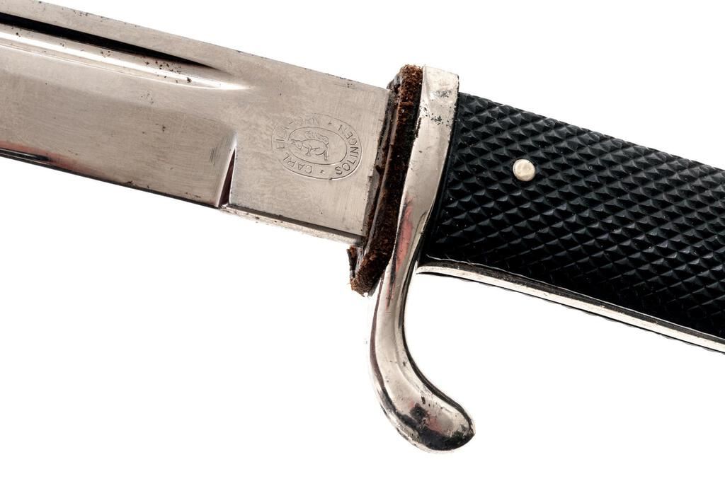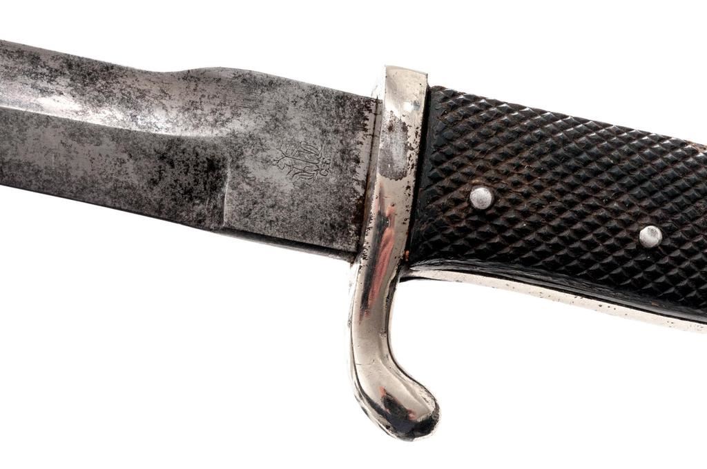 Lot of Two (2) German Dress Bayonets, with Frogs: (1) WW1 era dress bayonet, 10" blade was originally a saw back but has had the saw teeth removed, early Eickhorn double squirrel maker's mark at ricasso, checkered horn riveted grips, nickel-plated cross guard and eagle head pommel with pushbutton. In black painted steel scabbard, with WWII k98 bayonet leather frog showing faint maker's mark and dated 1942. Blade shows age graying and light rust stains, flaking to the nickel plating on the guard and pommel, wear and minor chips to the grips. Scabbard shows scuffs, scratches, and losses to the painted finish; frog shows age, scratches, and light wear. (2) Early Nazi era dress bayonet with 8" nickel-plated blade, early oval Eickhorn squirrel logo, original leather blade washer, nickel-plated cross guard and eagle head pommel, missing the pushbutton retainer; checkered hard rubber riveted grips, black painted steel scabbard, leather WWII k98 bayonet leather frog with retaining strap, no markings. Blade is mostly bright with minor freckling, light wear, and runner marks. Cross guard and pommel show light scratches and minor bubbling to the nickel plating. Grips are very nice. Scabbard shows scratches and losses to the paint; frog shows soiling and wear, with some cracking to the leather and strap. Est.: $200-$400/Lot.