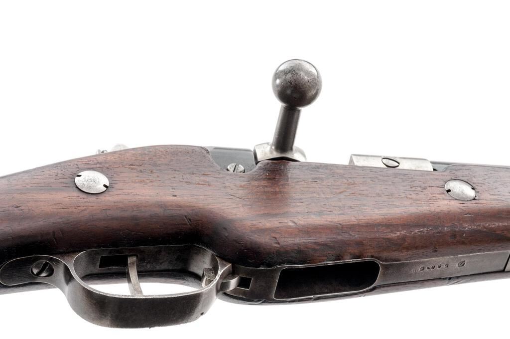 French Model 1907-15 Berthier Bolt Action Rifle, #59035, 8x50Rmm, 31.6" barrel, blued finish, hard wood stock set, blade front sight and adjustable folding leaf rear sight. Marked on left-side receiver "Chatellerault MLE 1907-15". Right-side barrel marked "MA C 1916". There is a faint roundel stamped into the right-side buttstock. Matching numbers. Condition overall is very good with the metal retaining approx. 70% finish, showing a spliced repair to the left-side forend. Wood has dark chemical type stains on both sides of the buttstock, otherwise the wood is good with cuts, scratches, and handling marks to the finish. Action operates smoothly, bright bore is excellent with well-defined rifling. No visible import marks. Est.: $600-$800. (C&R)