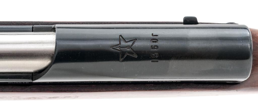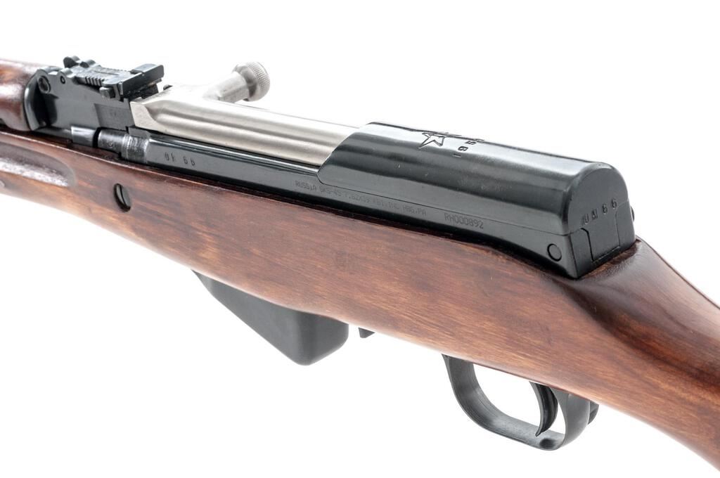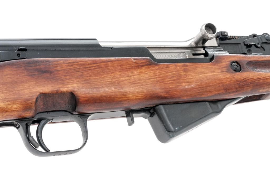 Soviet SKS Semi-Automatic Carbine, with Folding Bayonet, #RHOOO892, 7.62x39mm, 20.5" barrel, blued finish, hardwood stock set, hooded post front sight and adjustable tangent rear sight. Marked on top of receiver cover with the fletched arrow inside five-pointed star of the Tula Arsenal over "1950r". Bright bolt carrier. Visible original numbers match with stock re-numbered to match. Cleaning rod is fitted under the barrel but the buttstock cleaning kit is missing. No sling is included. Condition overall is very good with the metal retaining approx. 95% finish. There are scratches to the buttstock, otherwise the wood is very good, with scattered handling marks and scuffs to the shellac finish. Action operates smoothly; bore has darkening in the grooves that may clean better, otherwise very good with very good rifling. Import engraved and re-serial numbered by importer on left side of receiver. Est.: $700-$1,000. (C&R/PPT)