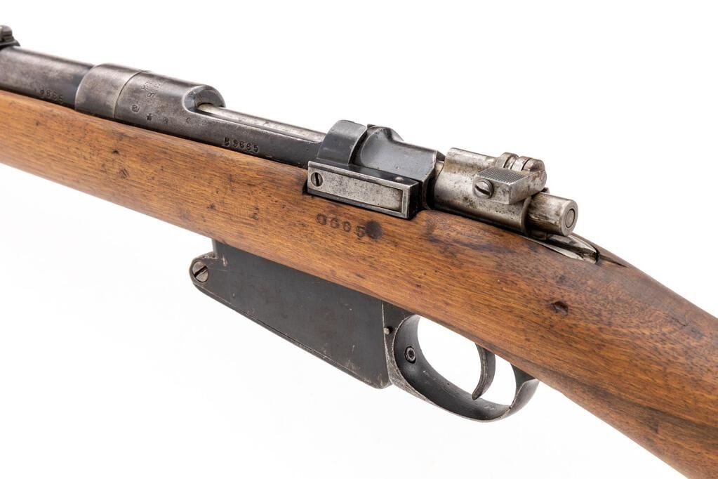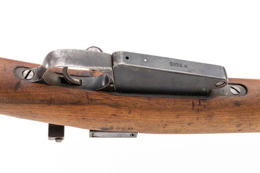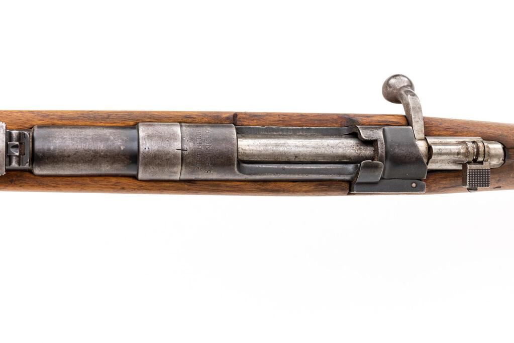 Shortened Belgian Model 1889 Mauser Bolt Action Rifle, #B9665, 7.65x53mm, 22" barrel, blued finish, hardwood stock set, inverted "V" front sight and adjustable folding leaf rear sight. Marked "ETAT BELGE BIRMINGHAM" on top of receiver ring. Matching numbers except for stock. Rifle appears to have been arsenal shortened to its present configuration. Condition overall is good with the metal retaining approx. 60% finish, showing thinning and patina and with a dent to the top of the barrel jacket. Wood has been sanded and oiled over old handling marks, now in good condition. Action operates smoothly; bore has a dark area mid barrel that may clean better, otherwise bright with very good rifling. No visible import marks. Est.: $300-$500. (C&R)