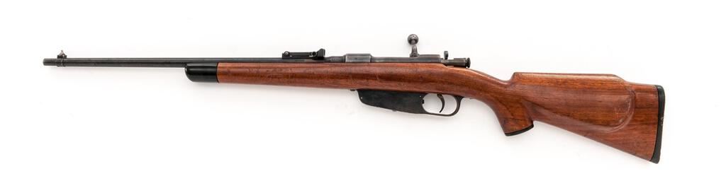 Modified Italian Model 1938 Mannlicher Carcano Bolt Action Rifle, #G2370, 7.35x51mm, 21" barrel, blued finish, walnut sporting stock with Monte Carlo cheekpiece and black forend tip. Issue military sights have been removed; front sight is a handmade post type sight; rear sight is a folding leaf "V"-notch with fine adjustment. Marked on top of barrel shank "(crown)/RE/TERNI", and on right side with the Fascist "1939 XVII". An "SA" Finnish property mark is stamped on the left side. Rifle has been modified by removing and replacing the military stock, hardware, etc. Condition overall is very good as modified with metal retaining approx. 60% finish. Stock is good with overall scratches and handling marks to the varnish finish. Action is smooth, bore has some darkening in the grooves with good rifling, and no visible import marks. Est.: $200-$300. (Modern)