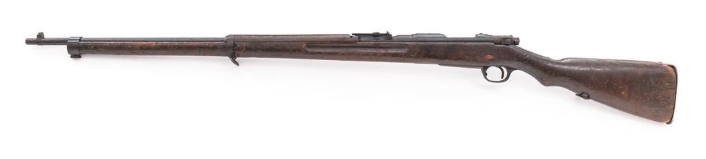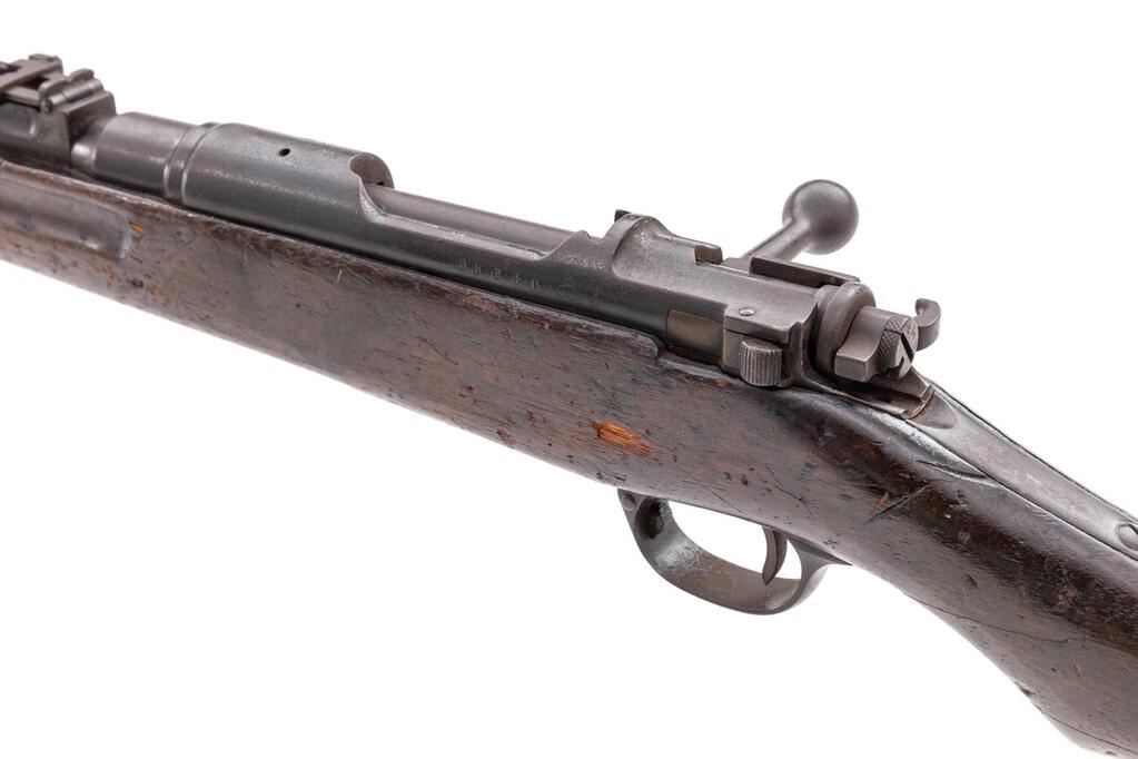 Japanese Type 30 Arisaka Bolt Action Rifle, #88661, 6.5x50mm, 31.1" barrel, blued finish, two-piece hardwood stock set, inverted "V" front sight and adjustable folding leaf rear sight with "V" notch. Missing cleaning rod, magazine floorplate and magazine spring. Marked on top of receiver ring with punch-defaced Imperial mum crest over characters for "30 Type". Left-side receiver rail marked with the symbol for the Koishikawa Arsenal. Right-side buttstock stamped with "110" rack number. Mismatched number on bolt handle. Buttplate has been polished bright and does not fit properly. Condition overall is fair with the remainder of the metal covered with patina. Wood is fair showing a crack at the wrist and overall dents, scuffs, and handling marks to the dark finish. The dark bore is poor with overall pitting. The safety will not engage, otherwise the bolt operates smoothly. No visible import marks. Est.: $300-$500. (C&R)