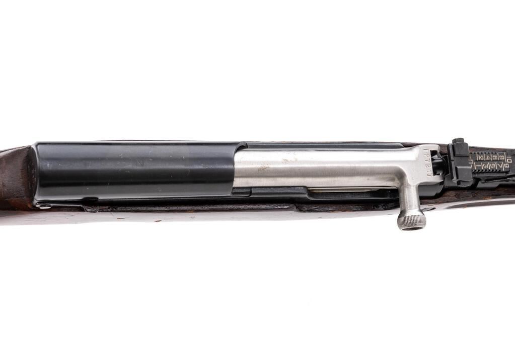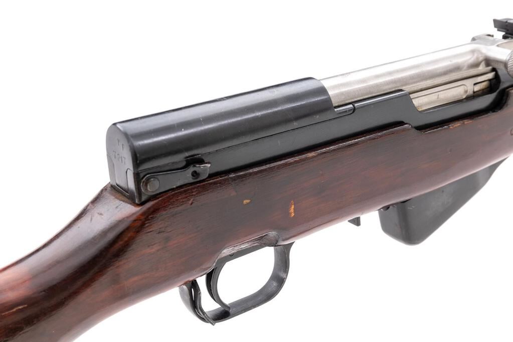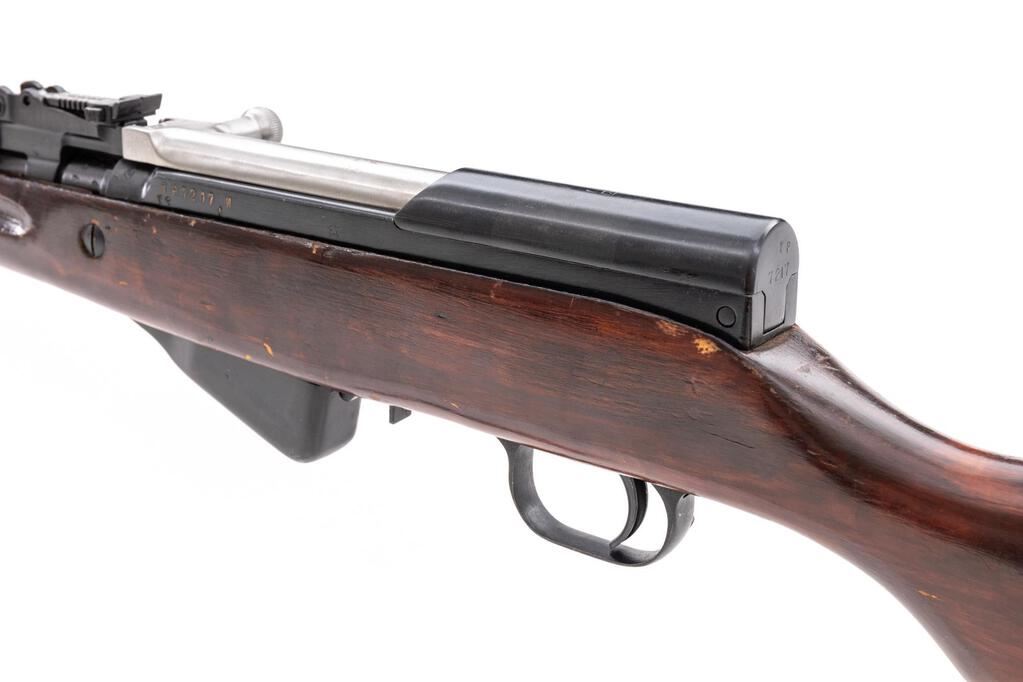Soviet SKS Semi-Automatic Carbine, with Folding Bayonet, #TP7217, 7.62x39mm, 20.25" barrel, blued finish, hardwood stock set, hooded post front sight and adjustable tangent rear sight. Carbine has been arsenal reconditioned, the mfgr's mark has been removed from the top of the receiver cover and a refurbishment mark stamped in its place with the area refinished. Left-side receiver is marked with a five-pointed star. Visible numbers match, with the right-side buttstock re-numbered from a previous serial number. Rifle is missing its cleaning rod and buttstock cleaning kit. Condition overall is very good with the metal retaining approx. 95% finish showing some scratches to the buttplate. Wood is very good showing recent scattered handling marks to the dark shellac finish. Action operates smoothly, bright bore is very good with very good well-defined rifling. Import stamped on right side of barrel. Bayonet is in excellent condition and also operates smoothly. Est.: $700-$900. (C&R/PPT)