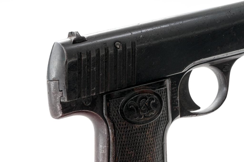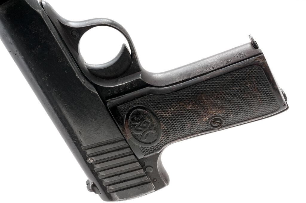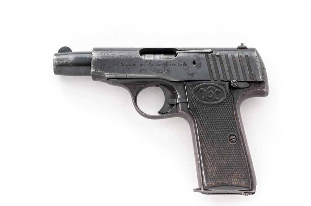 Walther Model 4 Semi-Automatic Pistol, #75695, 7.65mm, 3.5" barrel, blued finish, hardwood grips with Walther "WC" logo on each side, blade front sight and drift adjustable rear sight with "V" notch. Marked on left side slide "SELBSTLADE PISTOLE CAL. 7.65 WALTHER'S-PATENT" over a Walther Banner logo. Right-side slide markings have been removed. "(Circle)M" mark on right-side trigger guard. "(Crown)N" proof stamps on left-side frame and slide. Condition overall is fair showing pitting and patina scars under an old re-bluing. Grips are fair to good showing overall flattening to the checkering and a crack behind the right-side screw. Action operates smoothly, bore is dark with good rifling. Est.: $400-$600. (C&R/PPT)