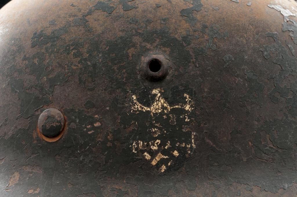 WWII German M42 Single Decal Army Steel Helmet, with dark green over paint, painted over Army eagle decal, stamped vent holes, no rolled rim on this model, faint stamped marking inside looks like "nkp64" and "1888", eight-tongue leather liner with original drawstring, and leather chinstrap. Condition is fair, the outer surface showing heavy losses to the original paint and over paint, with a large area on top showing a bare metal rust patina, numerous chips, scratches, scuffs, and paint losses around the sides and edges. The paint over the decal is worn and chipped to partially expose some of the details of the Army eagle. The inside shows wear to the original paint, minor rust and soiling. Liner is dark, stiff, heavily soiled, and shows light cracks around the edge. Chinstrap is dry and cracked but all there. Est.: $300-$500.