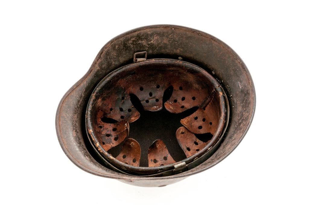 WWII German M40 Single Decal Army Steel Helmet, with liner, no chinstrap, original single Army eagle decal, stamped vent holes, old replacement liner not fitting well, and missing the drawstring. Stamped markings inside are "ET6(4)?" and "932". Condition is fair, the outer surface showing a thinning original green paint, with numerous scratches, scuffs, paint losses, and light rust patina showing through on the top, sides, and visor. Decal is about 90% with very minor losses, light rust showing through, and wear. The inside shows heavily scattered light rust, paint losses and heavy rust in the top. Liner is an old replacement that is smaller than this helmet. Leather is very dark, stiff, with numerous cracks and small tears. There is no chinstrap present. Est.: $250-$400.