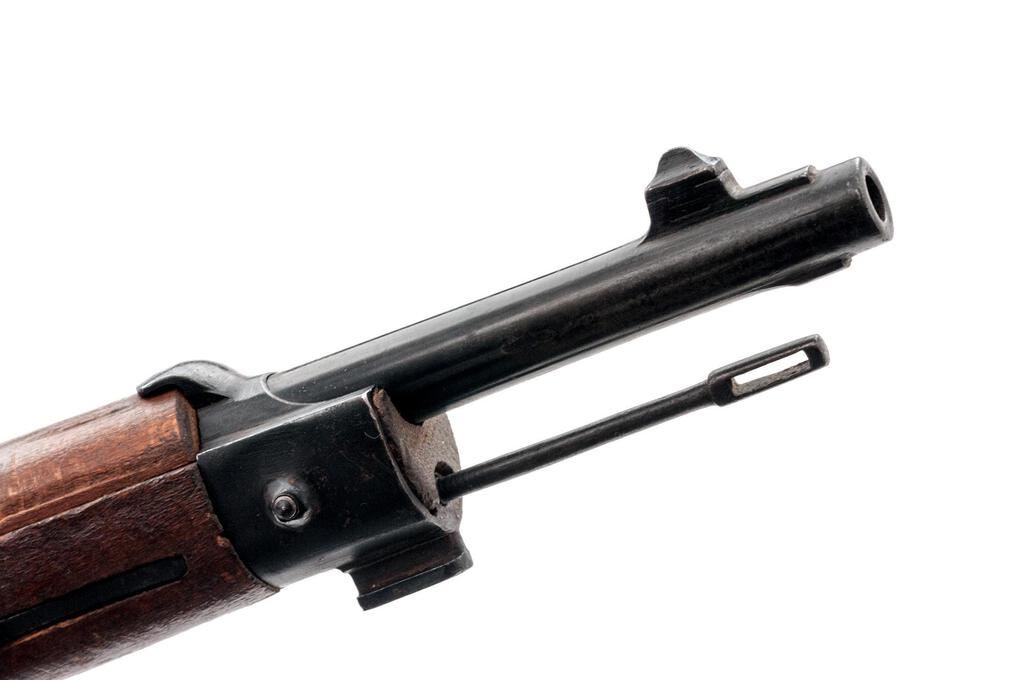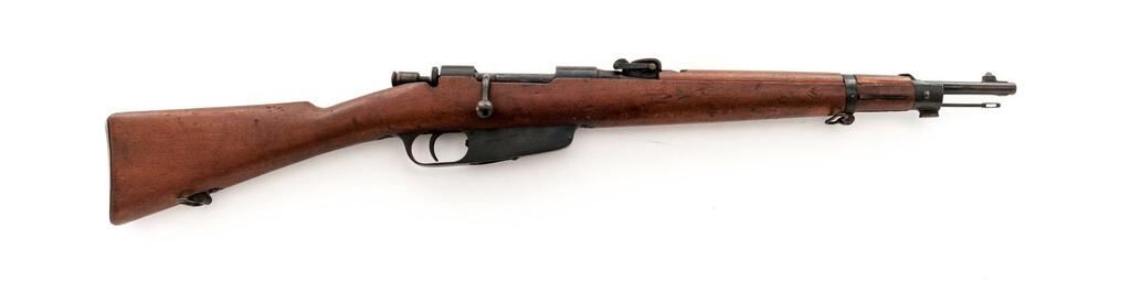Italian Model 1891 Moschetto Carcano Bolt Action Carbine, #AG2667, 6.5x52mm, 17.7" barrel, blued finish, hardwood stock set, inverted "V" front sight and adjustable leaf rear sight with "V" notch. Underside of stock cut for bayonet blade, and front band has small tab on top to secure hand guard. Cleaning rod is mounted under the barrel. Marked on top of barrel flat "BRESCIA", and "1917" on the right side. Left-side forend stamped with boxed "Op" mark; left-side buttstock stamped with cartouche over "REPARAZIONE 1938" repair mark ahead of matching stamped serial number. Mismatched number stamped on top of bolt handle. Condition overall is very good with the metal retaining approx. 80% finish, showing a mottled appearance to the receiver ring and patinaed parts. Wood is very good with overall handling marks to the even colored finish. Action operates smoothly; bore has darkening in the grooves with frosting forward of the chamber that may clean better. No visible import marks. Est.: $400-$600. (C&R)