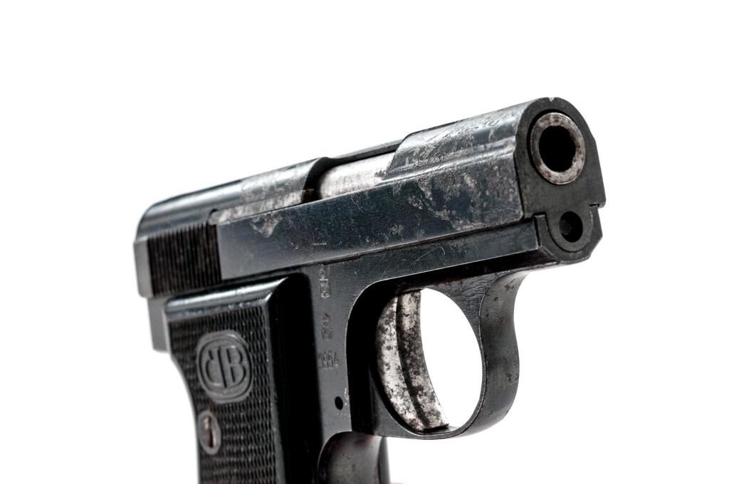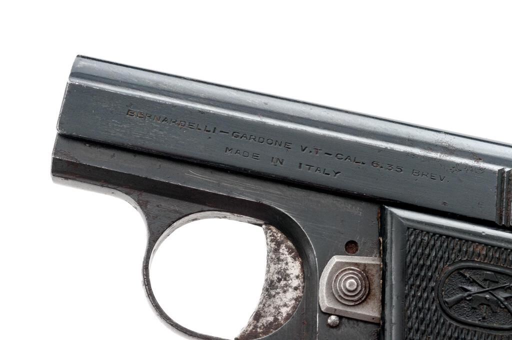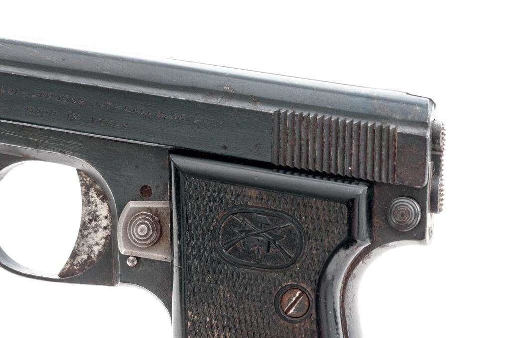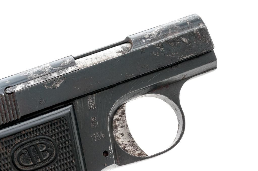 Bernadelli Vest Pocket Pistol, #68252, .25 ACP cal., 2-1/8'' barrel, blue finish, factory black plastic grips, with one magazine. Right side of frame is dated 1954. Condition is fair to good and retains approx. 70% blue. Slide with areas of finish loss that may have been chemically cleaned, with a few areas of spotted surface rust and dark spotting. Grips show moderate wear. Good action and lightly frosted bore. Est.: $150-$250. (C&R/PPT)
