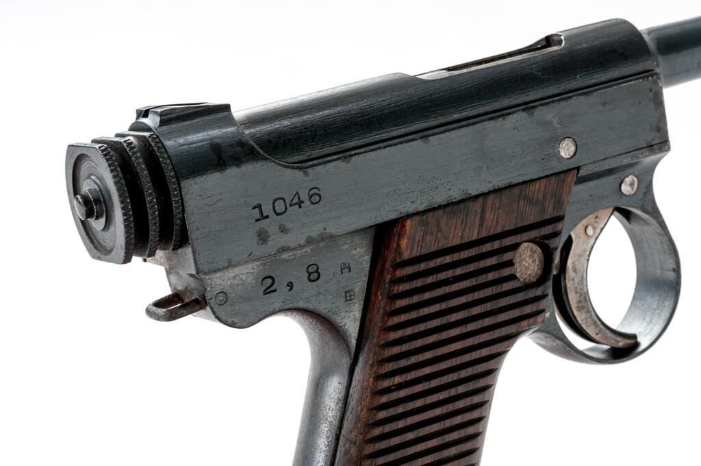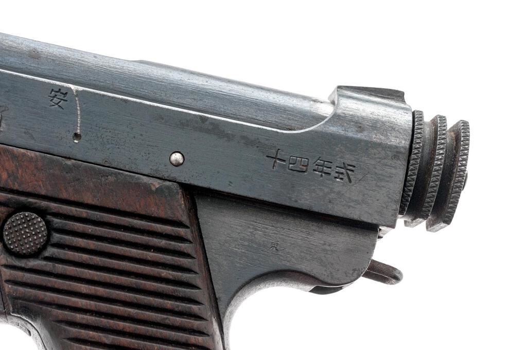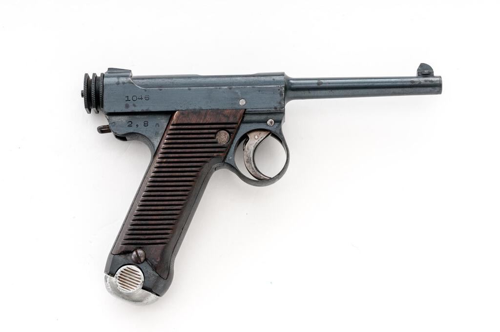 Early Japanese Type 14 Nambu Semi-Automatic Pistol, #1046, 8mm Nambu cal., 4.75" barrel, blued finish, straw finished trigger and safety lever, all visible numbers matching except magazine, Chigusa factory of the Nagoya Arsenal proof marks, dated Showa 2,8 (August 1927), small round trigger guard, drift adjustable inverted "V" front sight, integral fixed rear sight with square notch, early type knurled cocking knob, lanyard loop, 26-groove mahogany wood grips with no visible serial numbers, and one non-matching number nickel-plated magazine. Beginning in 1934 these early pistols were recalled to fit a magazine safety. This gun has that modification. Condition is very good as arsenal refinished, retaining approx. 90% blued finish, with minor pitting on the barrel, sides of slide and trigger guard, showing little to no holster wear to the finish, with minor wear lines on the rear of the slide from firing, and the typical half-moon scratches around the safety lever area. Front and rear grip straps show heavy freckling, trigger and safety lever show wear and losses to the straw finish with minor pitting, there is minor rust and staining on the bolt and around the lanyard loop. Action, hold open, and safety all function properly; bore is bright and shiny. Grips show age, soiling, scratches, and minor dings. Grip screws show wear and minor rust, with clean slots. Magazine shows light rust, stains, minor pitting, and wear from use, with some dings and rough areas on the base. Est.: $600-$800. (C&R/PPT)