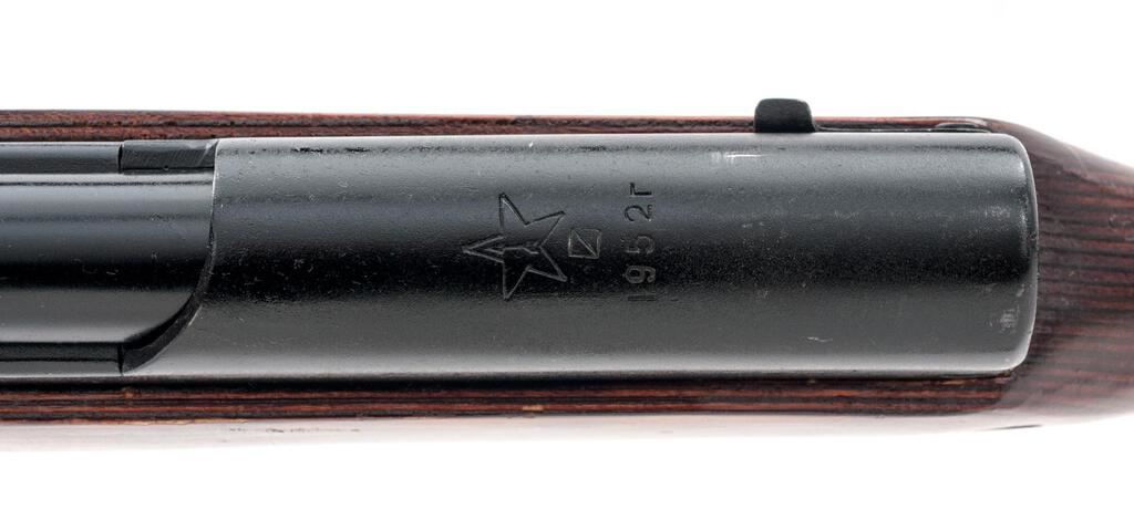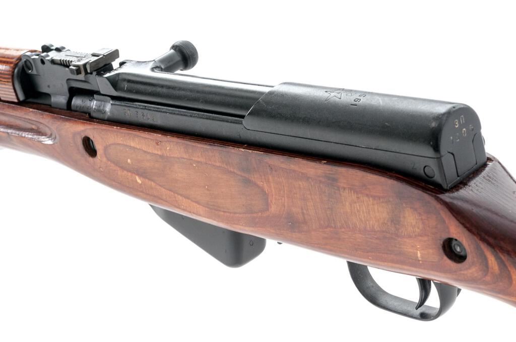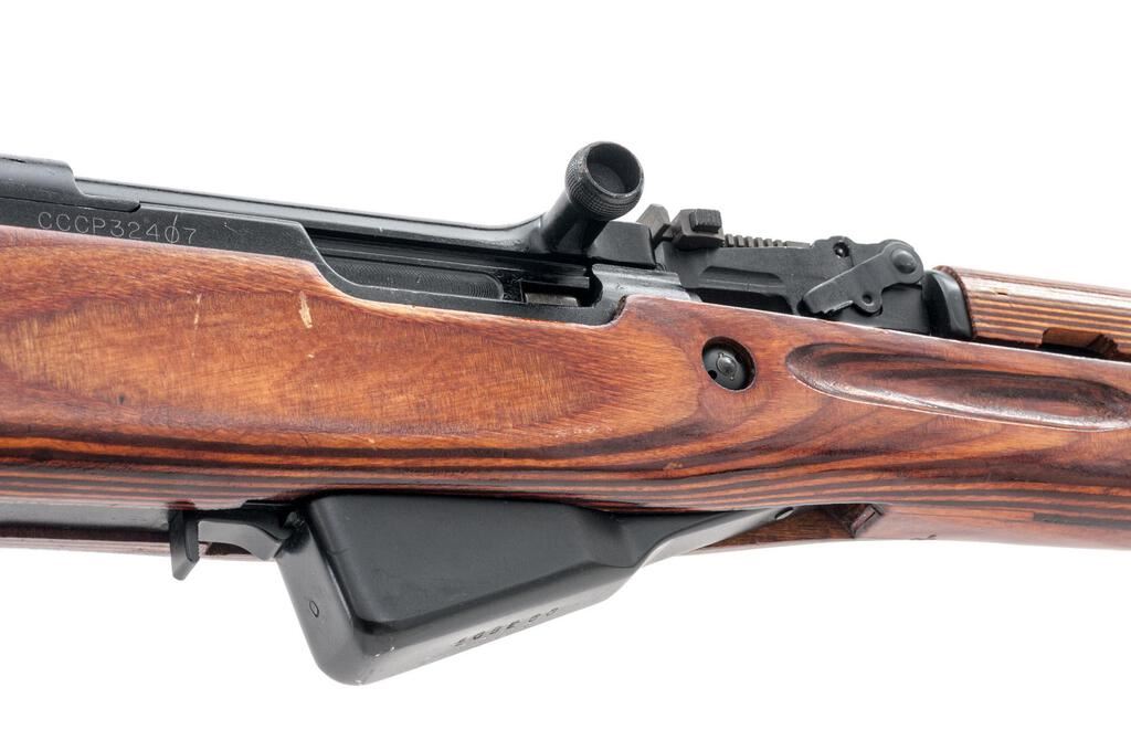 Soviet SKS Semi-Automatic Carbine, with Folding Bayonet, #CCCP32407, 7.62x39mm, 20.5" barrel, blackened finish, laminated stock set, hooded post front sight and adjustable tangent rear sight. Marked on top of receiver cover with the fletched arrow inside five-pointed star of the Tula Arsenal over "1952r". Also stamped with a later refurbishment stamp. Black bolt carrier. Visible original numbers match with magazine case renumbered to match. Cleaning rod is fitted under the barrel but the buttstock cleaning kit is missing. No sling is included. Condition overall is very good with the metal retaining approx. 95% finish, showing light wear to the edge of the bolt handle and bayonet collar. There are scratches to the left side of the forend as well as to the comb of the buttstock, otherwise the wood is very good, with scattered handling marks to the shellac finish. Action and bayonet operate smoothly, bright bore is excellent with well-defined rifling. Import engraved and re-serial numbered by importer on right side of receiver. Est.: $700-$900. (C&R/PPT)