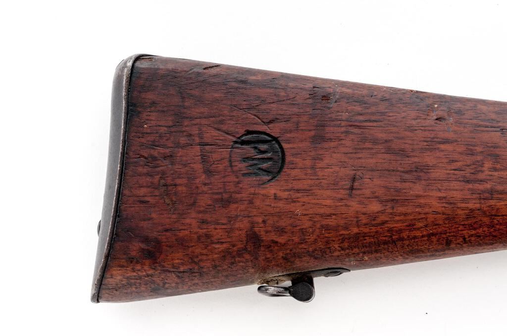 Italian Model 1891 Carcano Bolt Action Musketoon, #BD3541, 17.7" barrel, blued finish, hardwood stock set, inverted "V" front sight and adjustable leaf rear sight with "V" notch. Cleaning rod mounted under barrel. Top of receiver ring marked "RI". Top of barrel shank marked with faint "BRECIA". Right side marked "1918". Matching serial number on left-side buttstock behind faint cartouche stamp; right-side buttstock stamped "PM" in circle. Condition overall is good with the metal retaining approx. 50% finish, which shows scratches and surface frosting. Stock has several putty and varnish repairs done by a previous owner and there are cracks to the hand guard, otherwise the wood is good, showing impressions and handling marks to the dark finish. Action operates smoothly, dark bore is poor but has visible rifling. No visible import marks. Est.: $300-$500. (C&R)