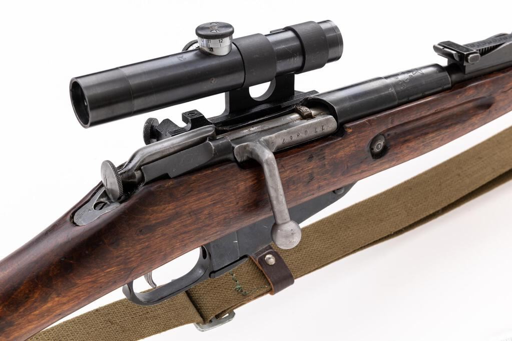 Finnish Property Marked Soviet Model 91/30 Mosin-Nagant Bolt Action Rifle, with PU Telescope, #170867, 7.62x54Rmm, 29" barrel, blued finish, hardwood stock, hooded post front sight and adjustable leaf rear sight. Cleaning rod mounted under the barrel, and a very good condition Soviet cotton sling is attached to the swivels. The bolt handle has been altered to look like a long turned-down sniper type by cutting and rewelding. Marked on top of barrel shank with the fletched arrow inside five-pointed star of the Tula Arsenal over "1936" and a stamped letter "D"; left side with "SA" Finnish property stamp. Right-side buttstock stamped with a circled "CCOP" cartouche forward of a circled "Rb" stamp. Matching numbers on receiver, barrel shank, and bolt; mismatched number on buttplate. Condition overall is very good with the metal retaining over 80% finish. Wear to the buttplate accounts for much of the finish loss. Forend and hand guard show scars and bruises to the right side, and three notches have been carved into the left side of the wrist, otherwise, the wood is good showing chips, handling marks, and scratches to the dark finish. Action operates smoothly, dark bore has light frosting and well-defined rifling. Import stamped on underside of barrel. The PU scope is marked "Star/Hammer & Sickle/Half Moon/91 30" and is numbered "No. b-156640", with round top turret screws. Mount is a reproduction. Condition overall is very good showing light scratches to the underside of the tube. Optics show a dull yellow color with a sharp reticle. Both knobs turn with effort. The mount is unmarked and is in excellent condition. Includes a very good condition leather lens cover and cotton scope cover. Est.: $700-$900. (C&R)