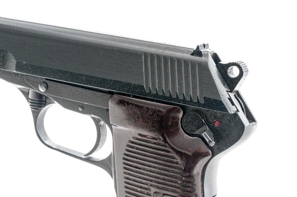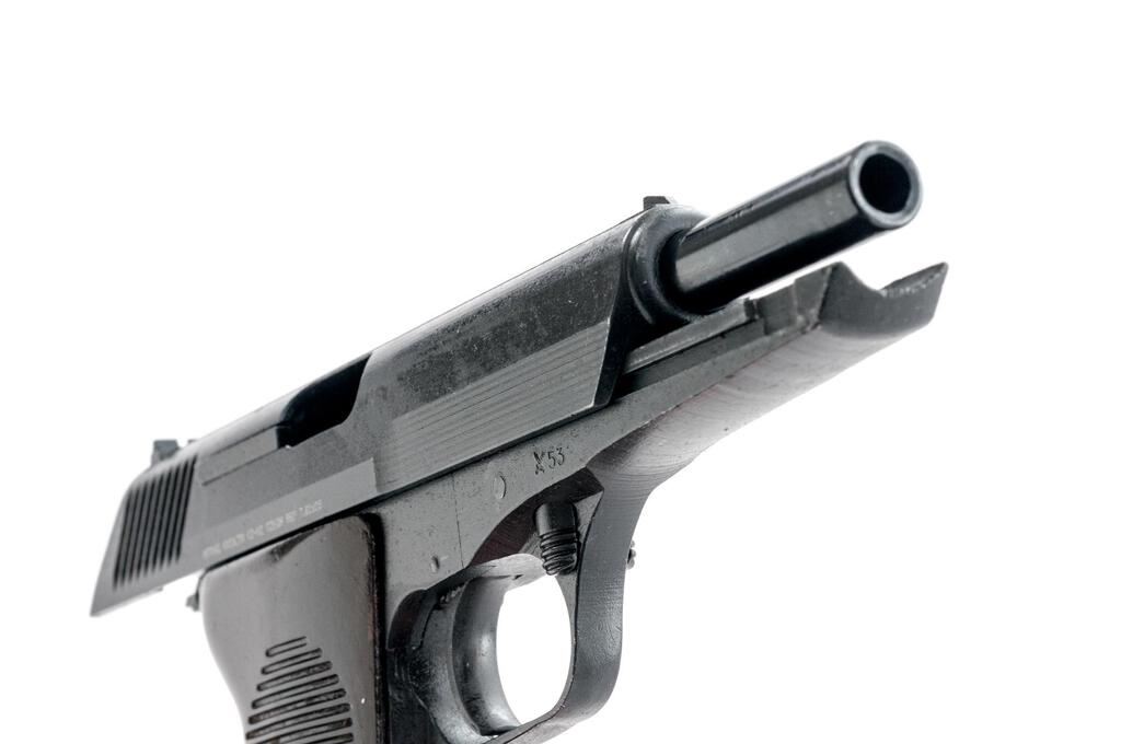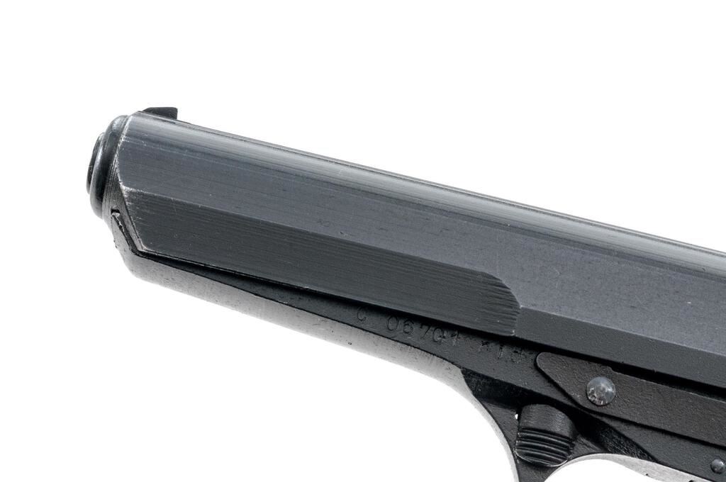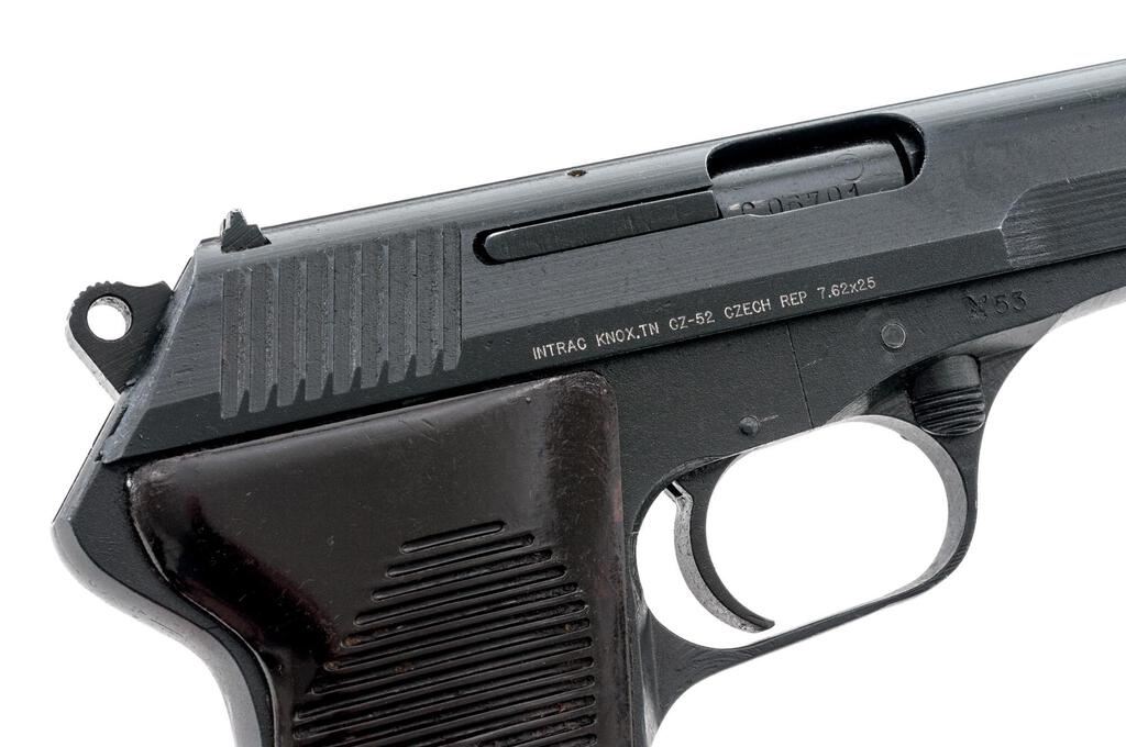 Czech Model CZ-52 Semi-Automatic Pistol, with Extra Magazine and Holster, #C06701, 7.62x25mm, 4.7" barrel, dark parkerized finish, grooved brown plastic grips, blade front sight and fixed "U"-notched rear sight. Magazine #1 is in good condition with light finish wear and a bend to the front lip of the floorplate. Magazine #2 is in good condition with light wear and patina and a bend to the front lip of the floorplate. This magazine will not lock slide to the rear. The tan Czech military holster is maker marked on the inside flap. Condition is about good with darkening, handling marks, and a small hole to the magazine pouch. All fittings are intact. A steel military cleaning rod is included. Pistol is marked "rid" on left side frame and "(crossed swords)53" on right-side frame. Matching numbers on frame, slide, and barrel. Condition overall is very good with the metal retaining over 90% finish. Right-side grip is in very good condition; left-side grip is in good condition showing chips and handling marks to the horizontal grooves. Action operates smoothly, bright bore is excellent with well-defined rifling. Import engraved on right side of slide. Est.: $400-$600. (C&R/PPT)