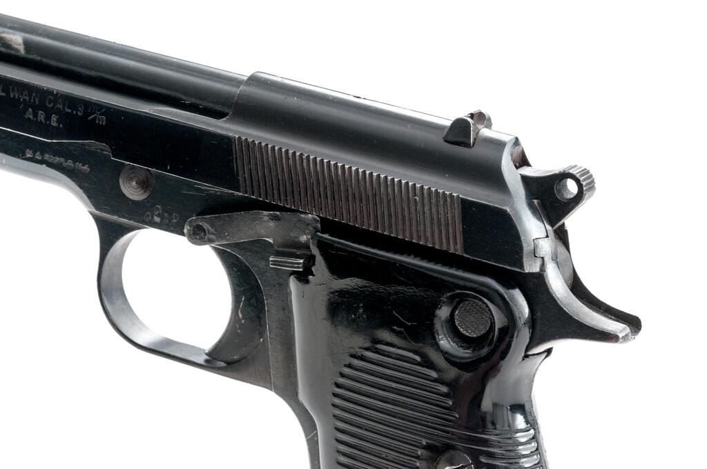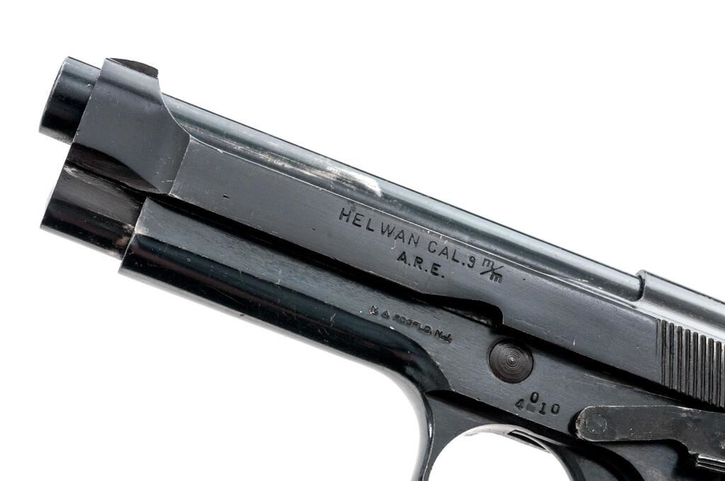 Egyptian Helwan Semi-Automatic Pistol, with 2 Magazines, #4010, 9x19mm, 4.5" barrel, blued finish, black plastic grips with horizontal grooves, blade front sight and drift adjustable rear sight with square notch. Magazine #1 is mfg'r marked on the spine and has a matching Arabic serial number engraved on the floorplate. Good condition with finish wear and frosting. Magazine #2 is mfg'r marked on the spine and has no serial number. Condition is good with patina to the floorplate. Pistol is marked "HELWAN CAL.9 m/m/A.R.E." on left-side slide and marked with Arabic script on right-side slide. Matching Arabic serial numbers on right-side frame and slide. Condition overall is very good with the metal retaining approx. 85% finish, with overall light scratches and handling marks. Grip panels have a gap in the rear where they don't fit together. Condition is very good showing mostly light handling marks and scratches. There is patina to the bolt face. Action operates smoothly, bright bore is very good with very good rifling. Import marked on left side of frame. Est.: $400-$600. (C&R/PPT)