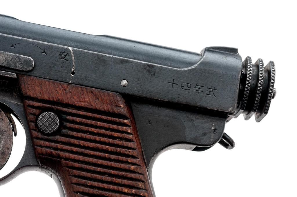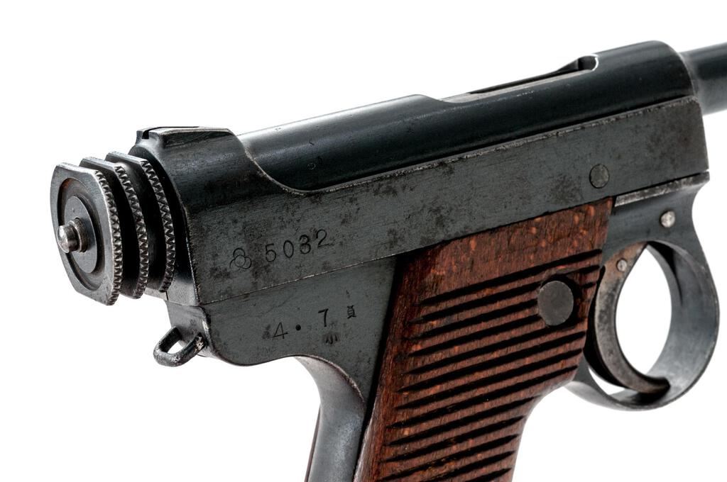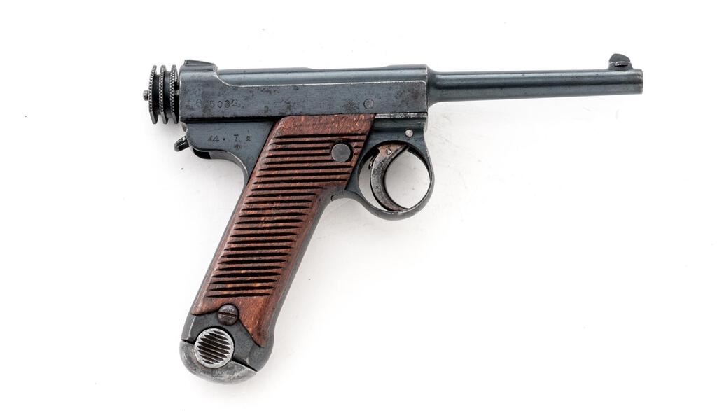 Early Japanese Type 14 Nambu Semi-Automatic Pistol, with 4 Magazines, #5032, 8mm Nambu cal., 4.75" barrel, blued finish, straw-finished trigger, all visible numbers matching except magazines, Koishikawa Arsenal proof marks, dated Showa 4.7 (July 1929), small round trigger guard, drift adjustable inverted "V" front sight, integral fixed rear sight with square notch, early type knurled cocking knob, lanyard loop, 25-groove beech wood grips with no visible serial number, has two different types of grip screws, two original non-matching number blued steel magazines with pot metal bases, and two original non-matching number nickel-plated magazines with aluminum bases. Beginning in 1934 these early pistols were recalled to fit a magazine safety. This gun has that modification. Condition is good retaining approx. 80% arsenal refinished rust bluing, with light pitting evident under the bluing, high edgewear to the muzzle, high edges of the slide and frame, trigger guard edges, scattered freckling on the slide sides, barrel, and sides of frame. Grip straps show heavy freckling and staining, typical half-moon scratches around the safety lever area to include a partial line on the left grip, rear segment of the cocking knob has a ding, and heavy wear and loss of finish to the straw on the trigger. Action, hold open, and safety all function properly; bore is lightly frosted overall with strong lands and grooves. Grips show age, soiling, minor dings and small gouges. One blued magazine is very good showing wear lines from use and oxidation to the base. The other blued magazine shows losses to the finish, freckling, pitting, and minor rust, with oxidation to the base. One nickel-plated magazine is very nice showing very light age and use, with minor dings on the base. The other nickel-plated magazine shows a few heavy rust spots, minor blemishes, and wear from use, with minor dings and soiling on the base. Est.: $600-$800. (C&R/PPT)