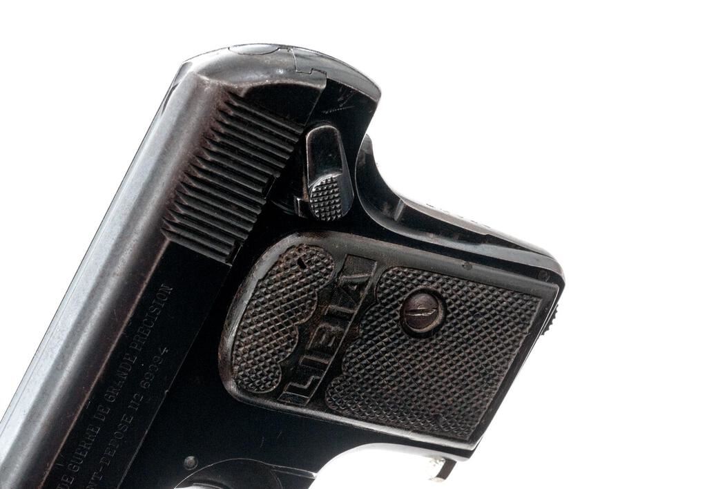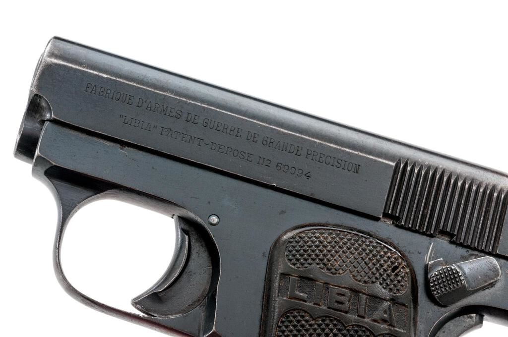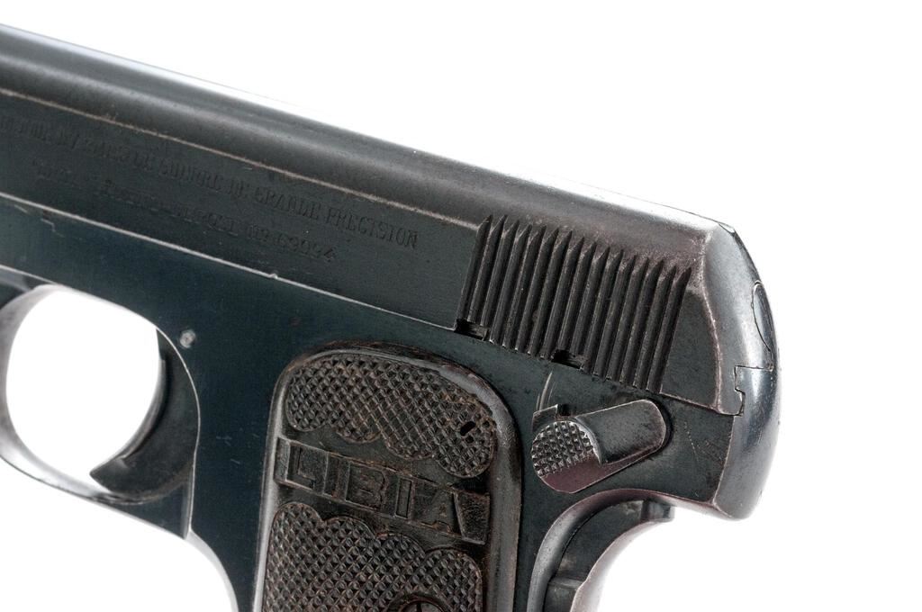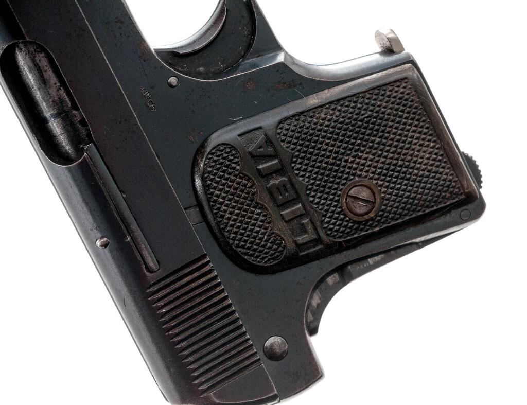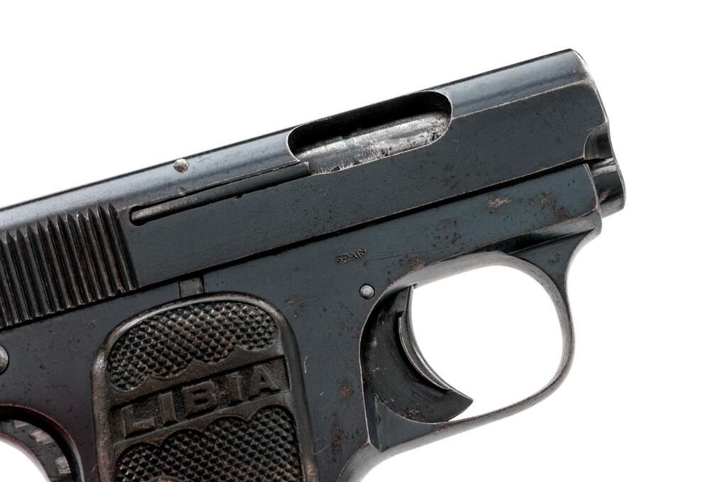 Spanish "Libia" Semi-Automatic Pistol, #40526, .25 AC cal., 1.87" barrel, blued finish, integral fixed blade front sight and fixed groove rear sight, grip safety, safety lever, slide marked "Fabrique D'Armes De Guerre De Grande Precision", "Libia Patent-Depose 112 69094", frame stamped "Spain", pressed checkered gutta percha grips with "Libia" lettering, and one bright nickel-plated magazine. Condition is very good retaining approx. 70% original finish, with wear, light scratches, and freckling on the top and sides of slide, light scratches on the rear of slide and frame, heavy wear to the finish on the grip safety, wear and freckling to the frame, front of the trigger guard, and front grip strap. Action and safety function properly, bore is heavily frosted but retains definable lands and grooves. Grips show age, some soiling, a couple of insect bites, and the right grip has a tight hairline fracture at the rear edge. Magazine shows wear from use and a couple of small spots of rust and loss to the nickel plating. Est.: $250-$400. (C&R/PPT)