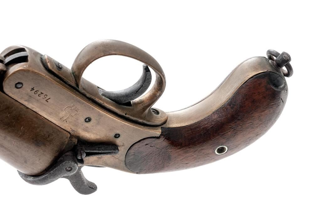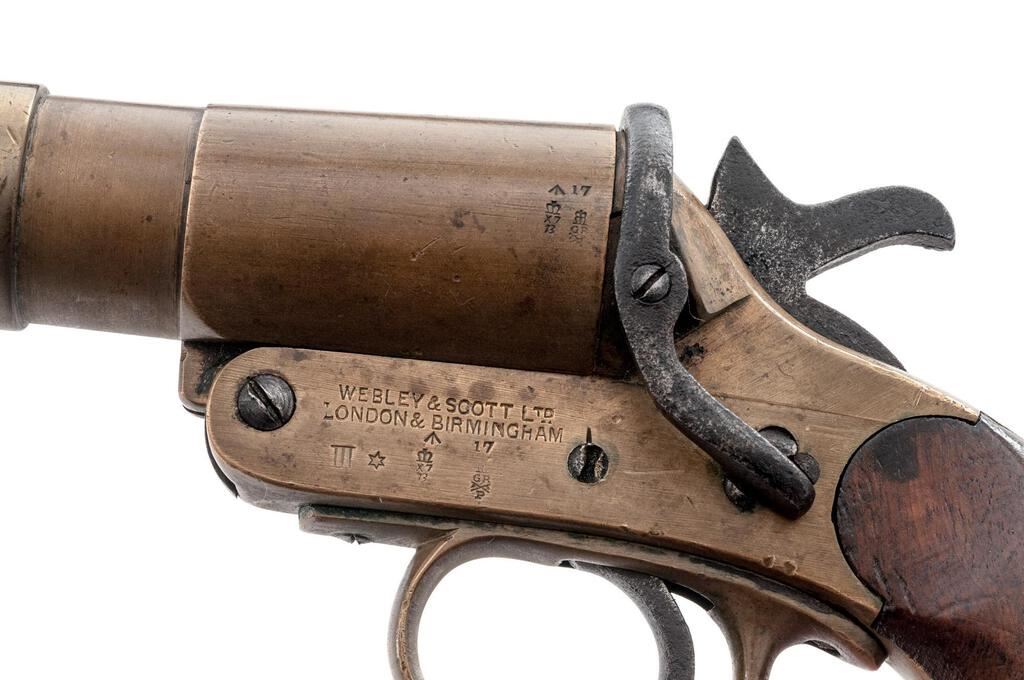 British Webley Mark III* Single Shot Flare Pistol, #76294, 1" bore cal., 5.6" barrel with bell, brass frame and barrel, smooth hardwood grips, no sights. Lanyard ring attached to bottom of grip. Marked on right-side frame with the Webley trademark "Winged Bullet/W&S" logo; left-side frame marked "WEBLEY & SCOTT LTD/LONDON & BIRMINGHAM" and "III*". Proof, inspection, and "?17" in-service marks stamped into left-side frame and barrel. Matching numbers on underside of barrel and extractor. Condition overall is very good, with the brass frame and barrel showing a few handling marks and a darkened patina. Steel hammer, trigger, and barrel stirrup have an overall patina. Grips have a few dark spots and show mostly light handling marks. Action operates smoothly; bore has some dark areas that may clean better, otherwise good. Est.: $250-$400. (Non-gun)