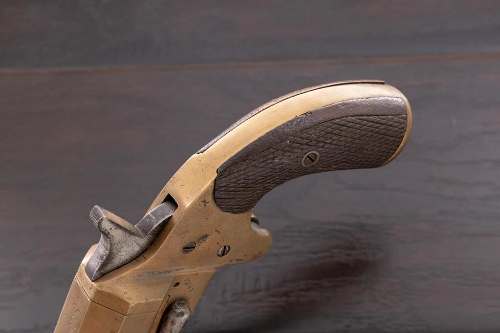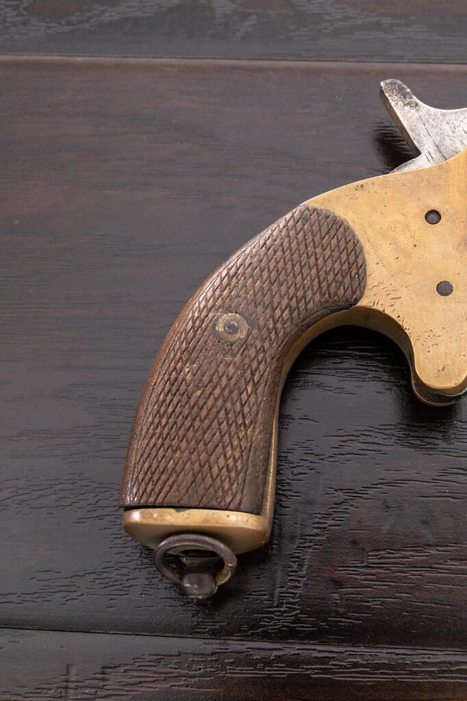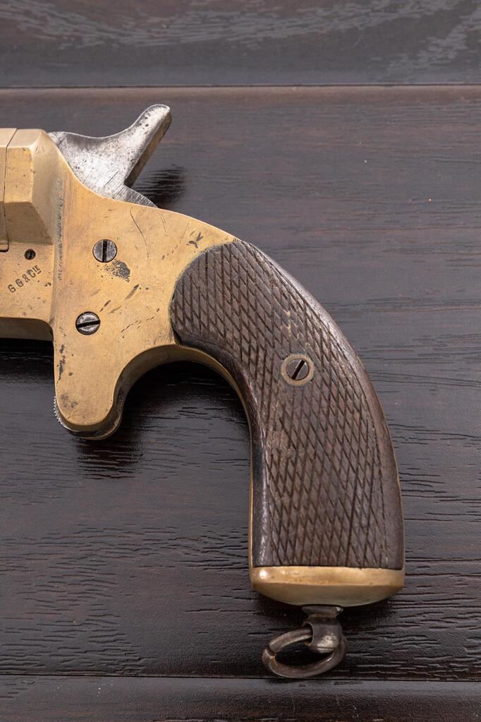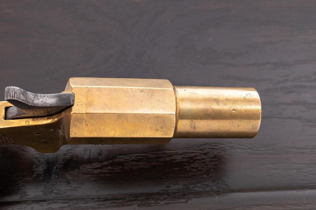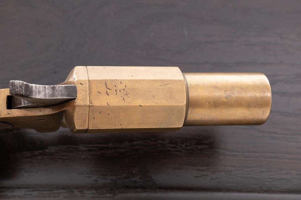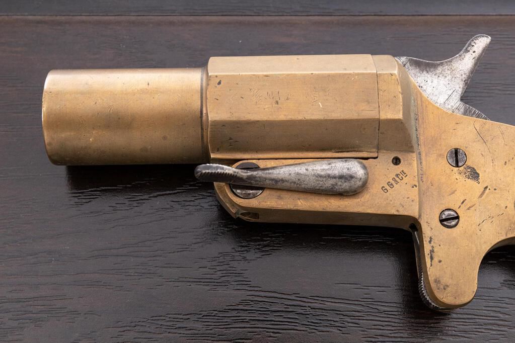 Lot of Two (2) WWI French M1917 Brass Flare Pistols, NVSN, 26.9mm bores, takes 25mm French flare cartridges, 4" barrels, brass body and barrels, steel external hammers, triggers, and side locking action levers, checkered wood grips, lanyard loop at bottom of grips, marked with a "V" on left side of frame and internal barrel lug. Made by G.G.&Cie (Grivolat Gerest Fils et Compagne). 1.) Frame and barrel have been cleaned and polished at some time in the past, showing numerous small dings and scratches. Steel parts show age graying and scattered light freckling with some cleaning. Action is very tight to open, hammer and trigger work well, nice bore. Action lever screw may be an old replacement. Grips have some vertical lines carved into them at the edges and show some scratches and small gouges. 2.) Frame and barrel have been cleaned and polished at some time in the past, now toning down nicely, showing numerous small dings and scratches and a nice bore. Steel parts show age graying and scattered freckling with some cleaning. Action is very tight to open, hammer and trigger work well. Grips show some age darkening, light dings and minor scratches. Est.: $300-$500. (Non-gun)