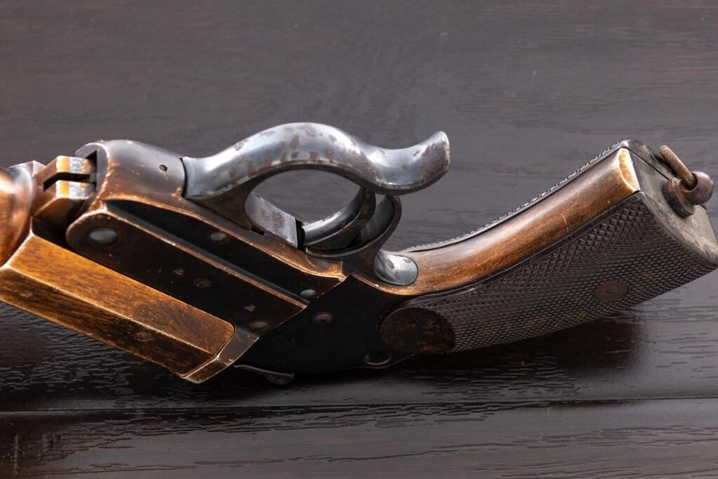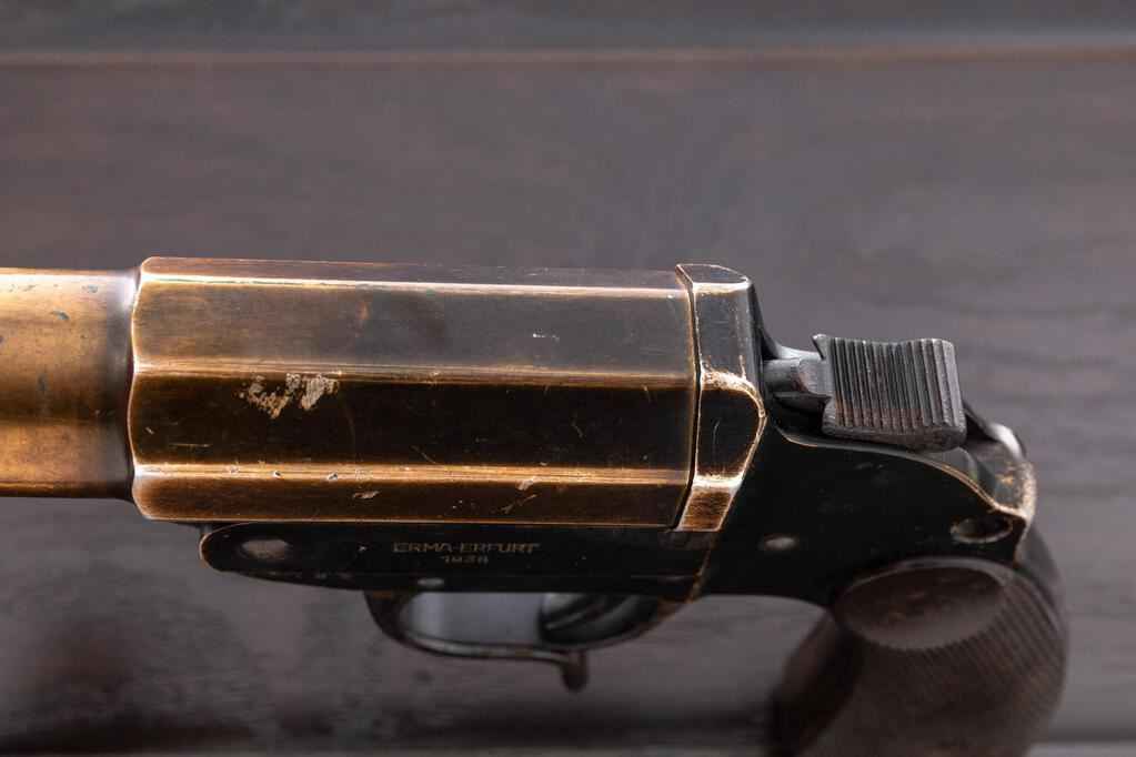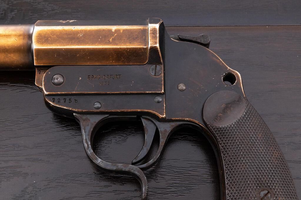 WWII German Leuchpistole 34 Flare Pistol, #7275b, 26.5mm bore, 6.1" barrel, aluminum, black anodized finish, underlever cocking mechanism, blued trigger, trigger guard, and cocking lever, external hammer, maker marked "ERMA-ERFURT" and dated 1938, Weimar eagle firing proofs and "(eagle)77" waffenampts on barrel and frame, lanyard ring at bottom of grip, and dark brown Bakelite checkered grips. Condition is good, the barrel finish fading to a golden color, high edgewear to the finish on the frame, front and rear grip straps fading to gold color, numerous light scratches, dings and wear. The blued trigger, trigger guard, hammer and cocking lever shows heavy rust freckling. Bore is frosted near the front half, and there is a large dent at the mouth of the barrel. Action opens ok, and the hammer and trigger work properly. Grips show soiling, light age, scratches, and a few flattened diamonds. Est.: $200-$300. (Non-gun)