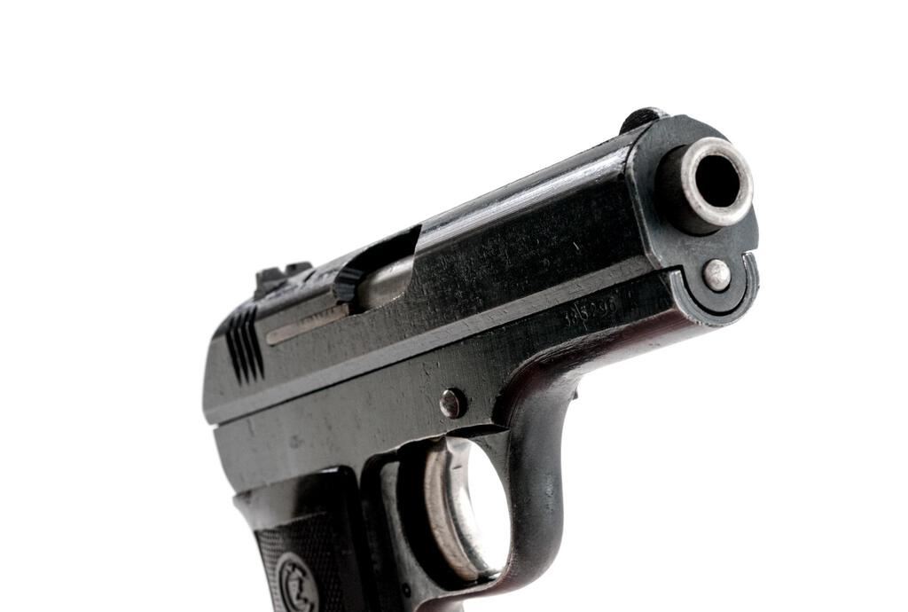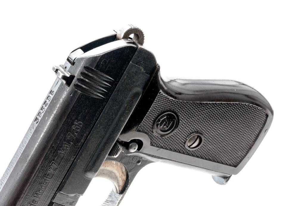 Czech CZ-27 Semi-Automatic Pistol, with Holster and Extra Magazine, #385296, .32 ACP cal., 3.9" barrel, blued finish, checkered one-piece dark red plastic grip with CZ logos on each side; blade front sight and drift adjustable rear sight with "V" notch. Pistol is marked on left-side slide "fnh Pistole Modell 27 Kal.7,65". Right-side frame marked with "WaA76" waffenampt stamp. "Eagle/Swastika" marks are stamped on top of slide and on barrel at ejection port. Both magazine floorplates are marked "P.MOD.27". Brown leather holster is marked on rear with large "P.Mod.27" along with a "CZ" logo, "(eagle)/WaA 76" waffenampt and "1942". Holster condition is good with the pliable leather showing handling marks and scratches to the dark finish. Extra magazine has a bent floorplate, otherwise good. Pistol has matching numbers on frame and slide. Pistol condition overall is very good with the metal retaining over 80% finish, showing wear to the front strap and rust patina spots to the frame and slide. The straw-colored hammer and trigger show darker toning. Grip is very good with a small chip and showing light handling marks to the checkering. Action operates smoothly, bright bore is excellent with well-defined rifling. Both of the magazines have bent floorplates and wear to the finish, otherwise good. No visible import marks. Est.: $500-$750. (C&R/PPT)