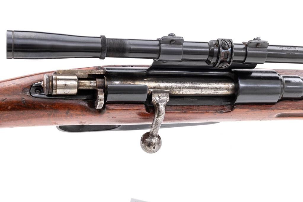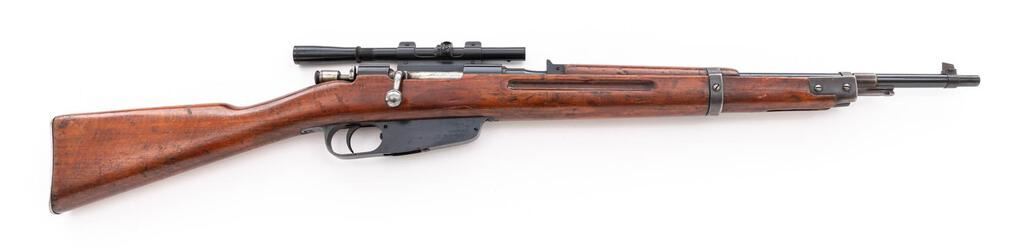 Italian Model 1938 Carcano Infantry Rifle, with Scope, #D3219, 7.35x51mm, 20.9" barrel, blued finish, hardwood stock, inverted "V" front sight and fixed "V"-notched rear sight. Marked faintly on top of barrel shank "(Crown)/R.E./TERNI", and on right side with Fascist "1939 XVII". A later Finnish "SA" property mark is stamped on the left side. There is an unreadable cartouche on the left-side buttstock forward of a mismatched serial number. Condition overall is very good as reconditioned, with the metal retaining approx. 90% reblued finish, the barrel and receiver polished bright, and some parts showing browning or spots of patina. Wood has been sanded and varnished, now very good, showing old and new handling marks and scratches. Action operates smoothly, bright bore is very good with very good well-defined rifling. Scope is marked "PAN-TECH JR. ENCINITAS.CALIF.". Scope condition is good with areas of patina present on the tube; optics are clear and bright. Est.: $400-$600. (C&R)
