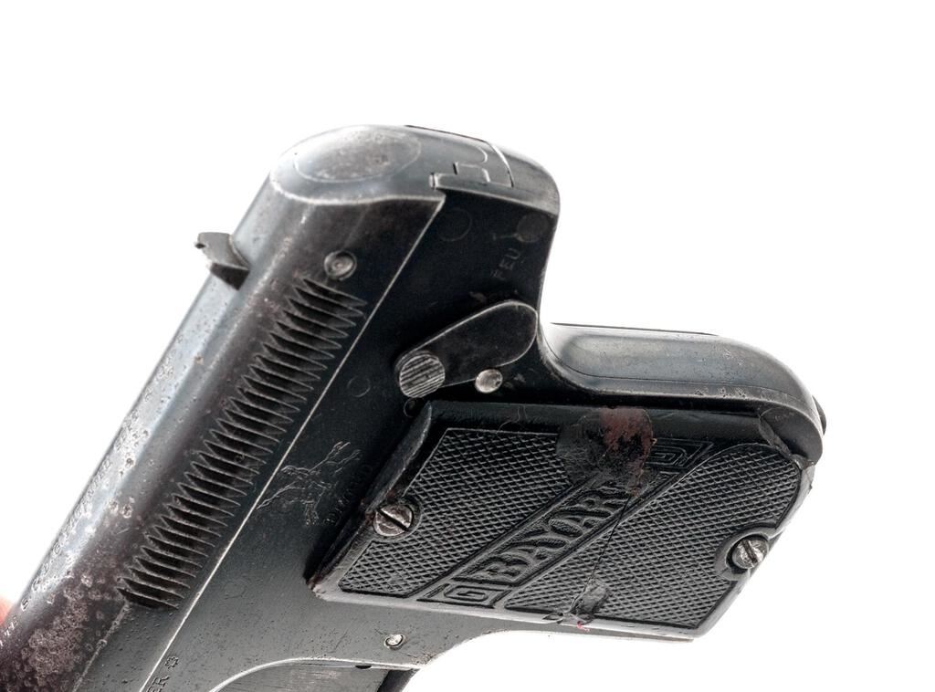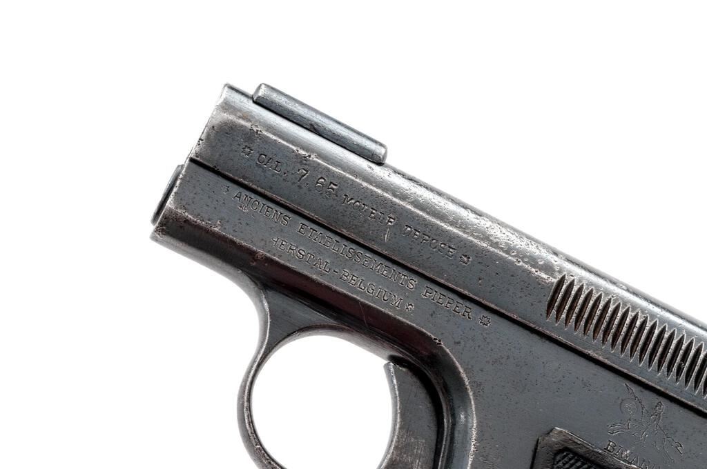 Belgium Bayard M1908 Semi-Automatic Pistol, #184717, .32 ACP cal., 2.25" barrel, blued finish, fixed blade front sight and fixed rear sight with small "v" notch, slide marked "Cal 7.65 Modele Depose", frame marked "Aciens Etablissements Peiper" Herstal-Belgium, Brevete patent info and date 1908 on top of slide, horse and lancer logo on frame, Imperial German eagle proofs on front of slide and frame, with "(crown)/F" proof. Hard rubber black checkered grips with "Bayard" lettering. Bottom mag release with one blued steel original magazine. Condition is fair retaining approx. 60% original finish, with wear and pitting to the top of the slide, freckling on sides of the slide, some pitting and dings on sides of the frame, pitting and wear on front and rear grip straps and trigger guard, and wear from use on sides of the trigger. Action and safety function properly, bore is heavily frosted with strong lands and grooves. Right grip is good showing scratches and minor gouges; left grip is broken in two and glued, with chipping, scratches, and losses at the bottom edge and top corner. Magazine shows wear from use and light rust on one side. Est.: $250-$400. (C&R/PPT)
