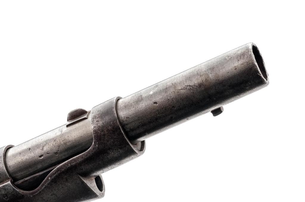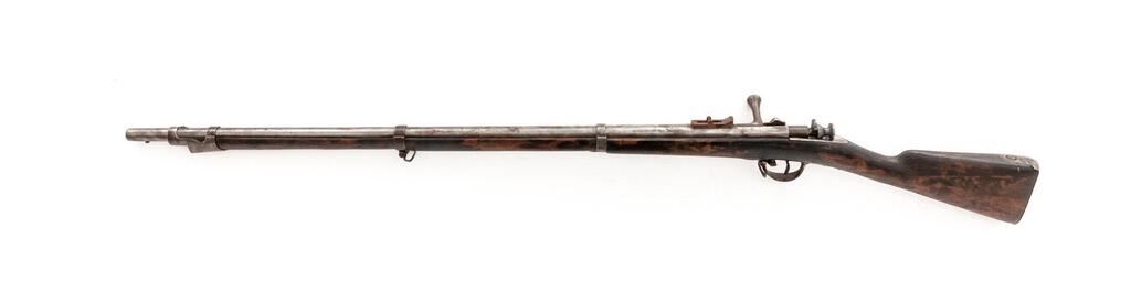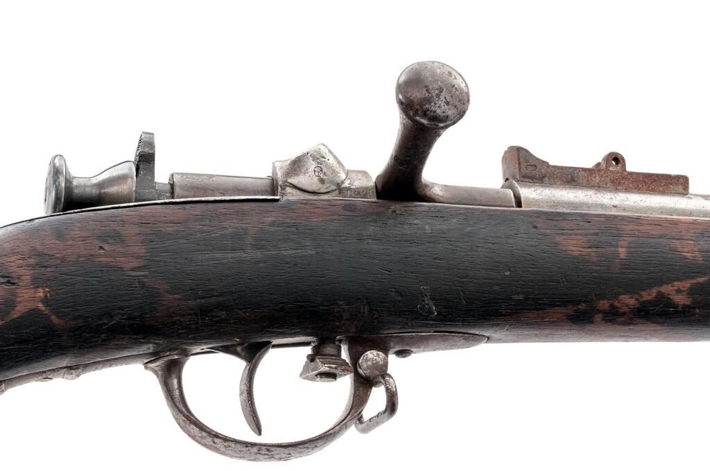 Scarce Antique Carcano Model 1868 Needle Fire Rifle, #953, converted from percussion, 17.5mm, 37.25" rifled barrel, straight grip nearly full-length wood stock with steel buttplate. Small blade front sight, rear sight base only. Sling swivel mounted to the middle band and front of trigger guard. Right side is dated, what looks like "1864". Large upside down "26" is stamped on right side of the buttstock with smaller horizontal "3728". There is an illegible proof mark on the old percussion base, small numbers stamped on inside of the trigger guard. After the noticeable battlefield success of the Dreyse needle fire rifle. The Italians began these conversions in 1867, using Salvatore Carcano's system. Condition is good with scattered areas of rust patina and moderate pitting to the metal. Heavier rust is present on the rear sight base. Wood with dark staining throughout, scattered dents and scratches. There is a crack to the right side of the forend that runs the full length, between the front and mid-barrel band. Action is stiff and functions but not smoothly. Needle sticks approx. 1/8" past the bolt face. Rifling is visible but the bore is dark with heavy frosting and some visible erosion. Hard to find in any condition. Est.: $700-$900. (Antique)