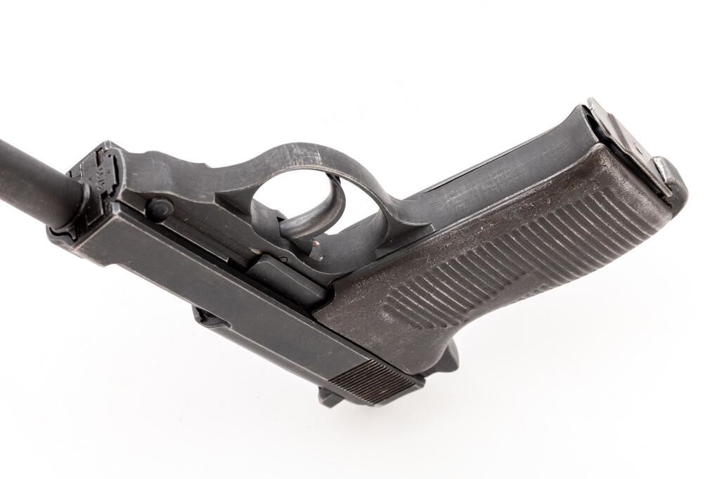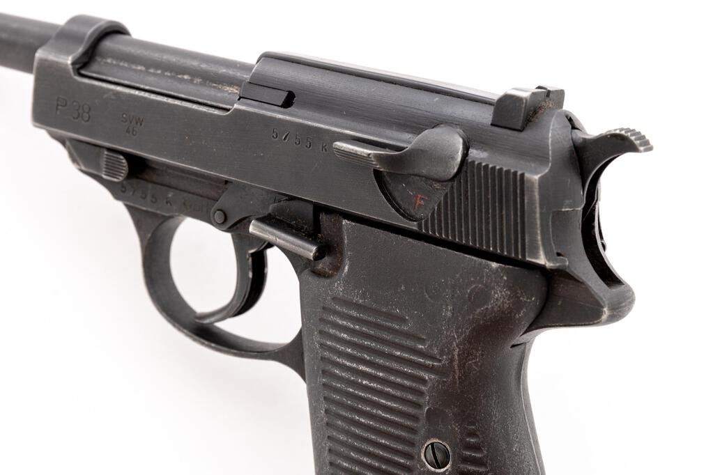 Post-War French Production P-38 svw-46 Semi-Automatic Pistol, #5755k, 9mm, 5" barrel, dark gray phosphate finish, double action, French star proof on slide, hammer drop safety, drift adjustable blade front sight and fixed rear sight with small "u" slot, all visible numbers matching, post-war Austrian eagle and BH police stamp on frame above the trigger guard, small round proof on trigger guard edge; lanyard loop, bottom mag release, gray metal grooved grips, and one blued steel magazine marked P.38v, serial number 3682, and faint "(eagle)359" proof on back spine. Condition is near excellent retaining approx. 95% original gray phosphate finish, with wear at the sides of the muzzle, tops of sights, high edges of slide, trigger guard edges, tips of the hold open and safety levers; front grip strap is very strong showing almost no wear, edgewear to the mag release and lanyard loop. Action has old dried oil and grease that makes it a bit sluggish, but a good cleaning should remedy that; bore is bright with just a hint of frosting. The hold open works if you push up slightly on the magazine, with another mag in place it functions properly. Hammer drop safety is a bit gummy but works properly. Metal grips show some high edgewear and minor scratches. Magazine shows only light wear from use. Est.: $600-$900. (C&R/PPT)