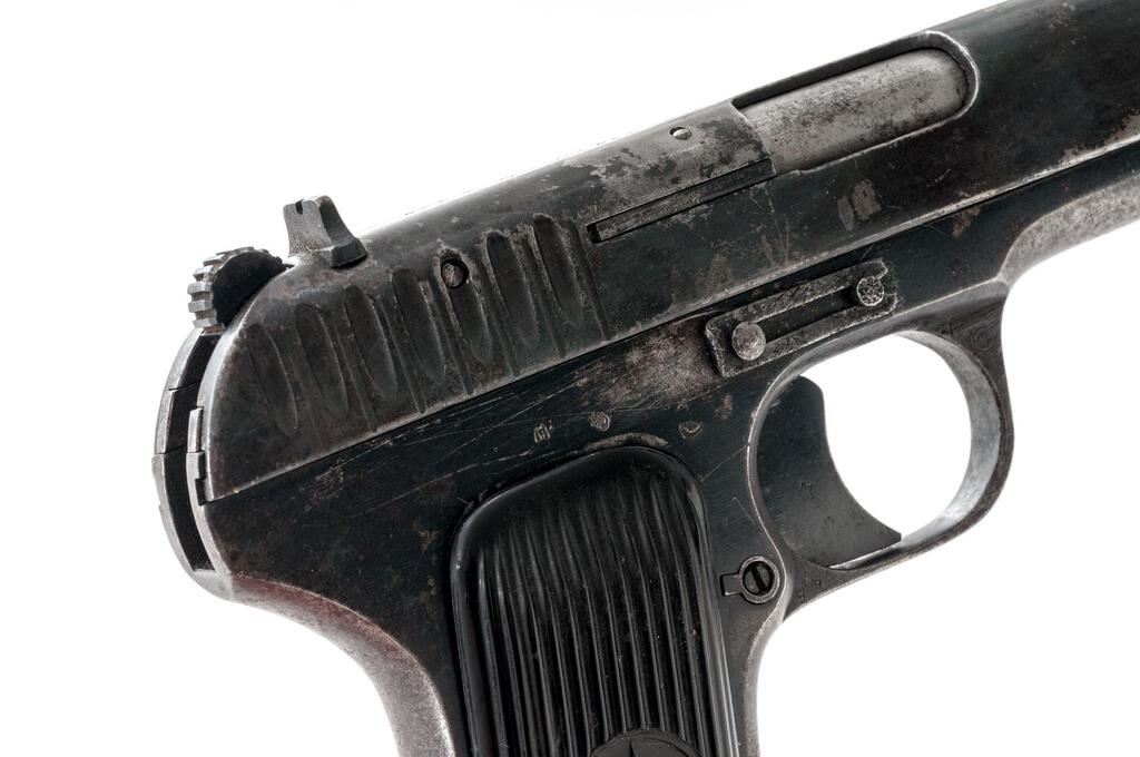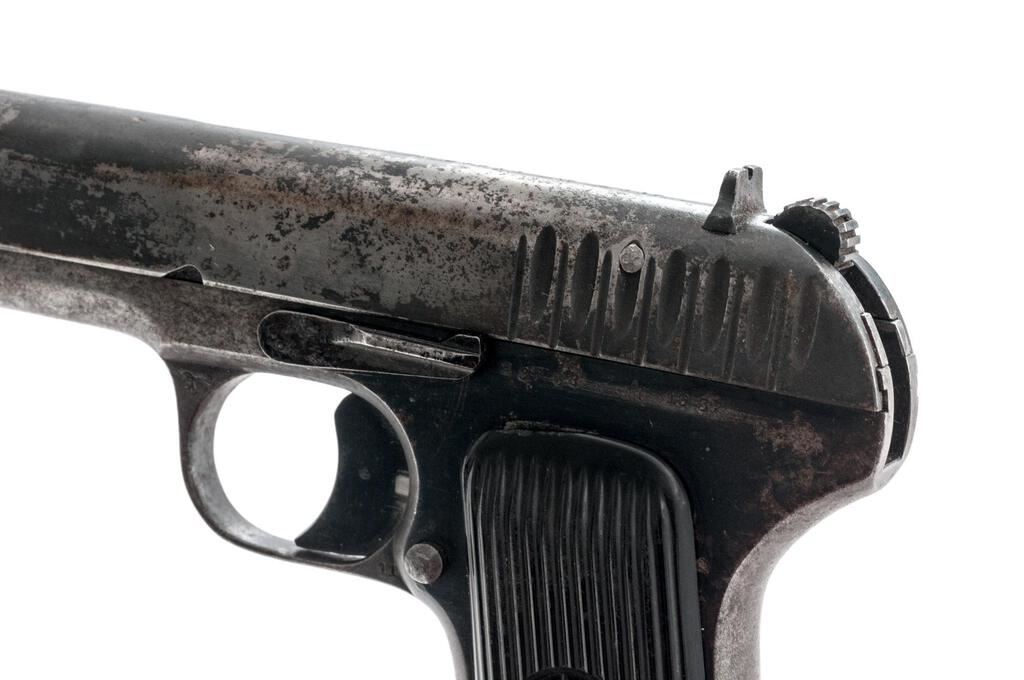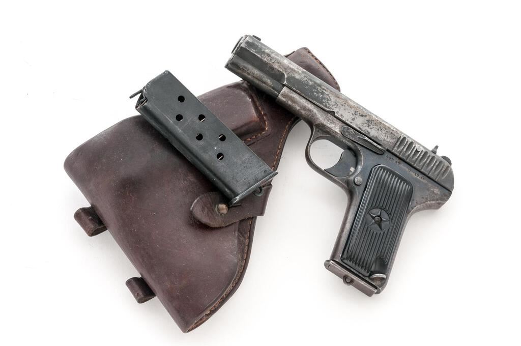 Soviet TT-33 Semi Automatic Pistol, with Accessories, #29768, 7.62x25mm, 4.6" barrel, blued finish, black plastic grips with vertical checkering and five-pointed star in center, blade front sight and fixed "U"-notched rear sight. Marked on left-side frame and top of slide with matching numbers and "(star)1937". Pistol has lanyard loop installed on left side of grip frame. No safety lever. Condition overall is fair with the metal retaining approx. 30% finish, showing thinning, patina, and darkening. Grips appear to be later replacements and are in very good condition with scattered handling marks to the checkering. Action operates smoothly, bore has darkening in the grooves with good rifling. No visible import marks. Magazine #1 has a lanyard loop on the base and is in very good condition showing light wear. Magazine #2 has a lanyard loop on the base and is in fair condition with overall wear and patina. Holster is unmarked and has a repaired loop on the rear. Holster condition is good showing overall wear and handling marks. No cleaning rod is present. Est.: $400-$600. (C&R/PPT)