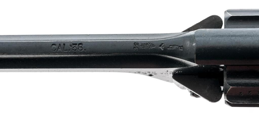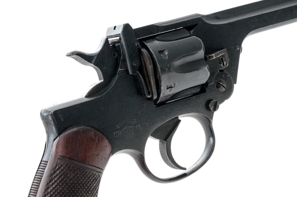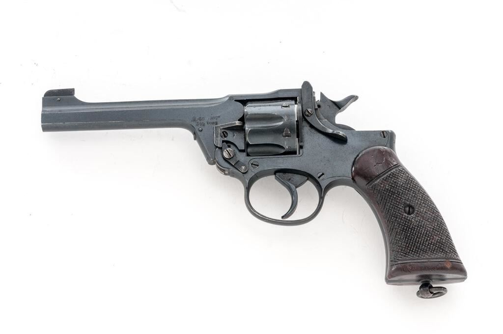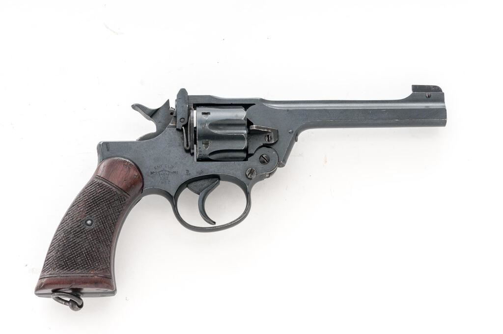 British No. 2 Mk 1 Enfield Double Action Revolver, with Holster, #A8924, .38 S&W cal., 5" flat sided barrel, blued finish, checkered walnut grips, blade front sight and fixed square-notched rear sight. Lanyard ring is attached to bottom of grip frame. Marked on right-side frame "ENFIELD/(Crown)/No.2 Mk 1/1932". Top of barrel flat stamped "CAL.38./32/proof/Broad Arrow/Enfield view stamp". Rear of frame has stamped unit markings that have been barred out. Matching numbers on frame, barrel, and cylinder. Condition overall is very good with the metal retaining approx. 95% of its bluing, now muted with scattered dark spots. Grips are very good showing chips, handling marks, flattening to the checkering, and darkening to the varnish finish. Bright bore has good rifling, chambers are clean and bright. Barrel assembly is slightly loose when locked to the frame, but the action cycles and ejects smoothly. No visible import marks. Holster is marked "M.W.&S. LTD 1954" and has a "ENGLAND" import stamp on the lower belt loop. Condition is good with all straps in place. There is a light brown stain across the surface and green verdigris on the rear. Est.: $600-$800. (C&R/PPT)