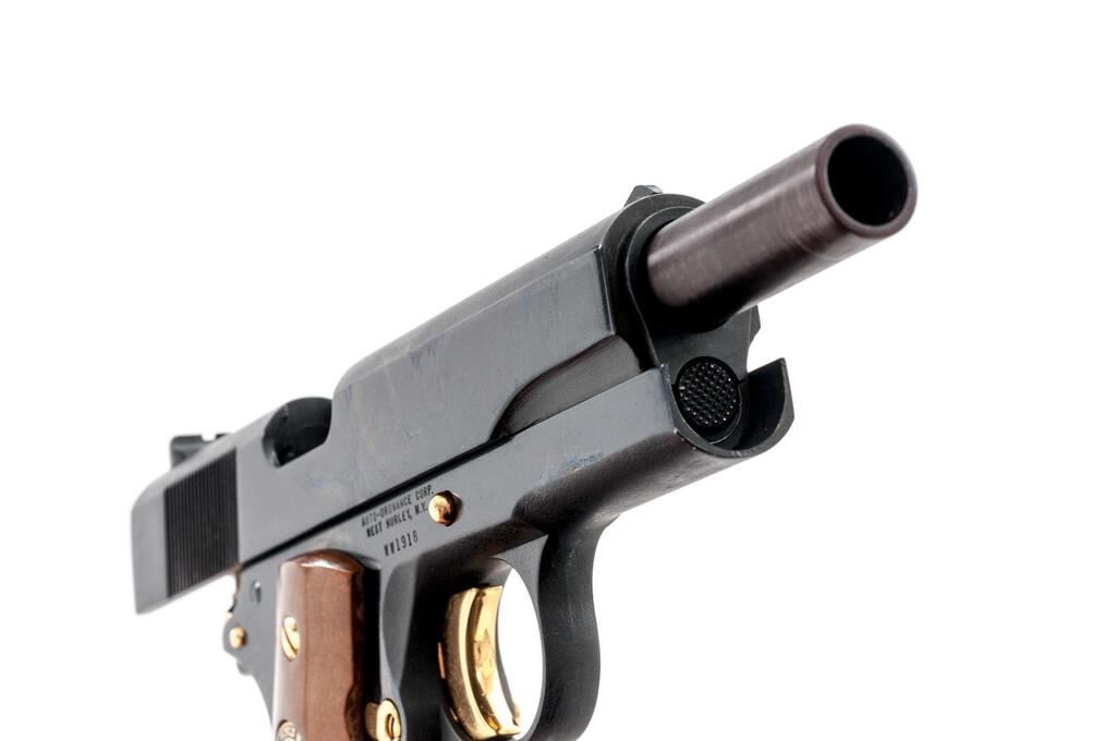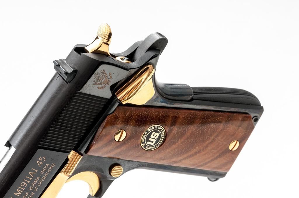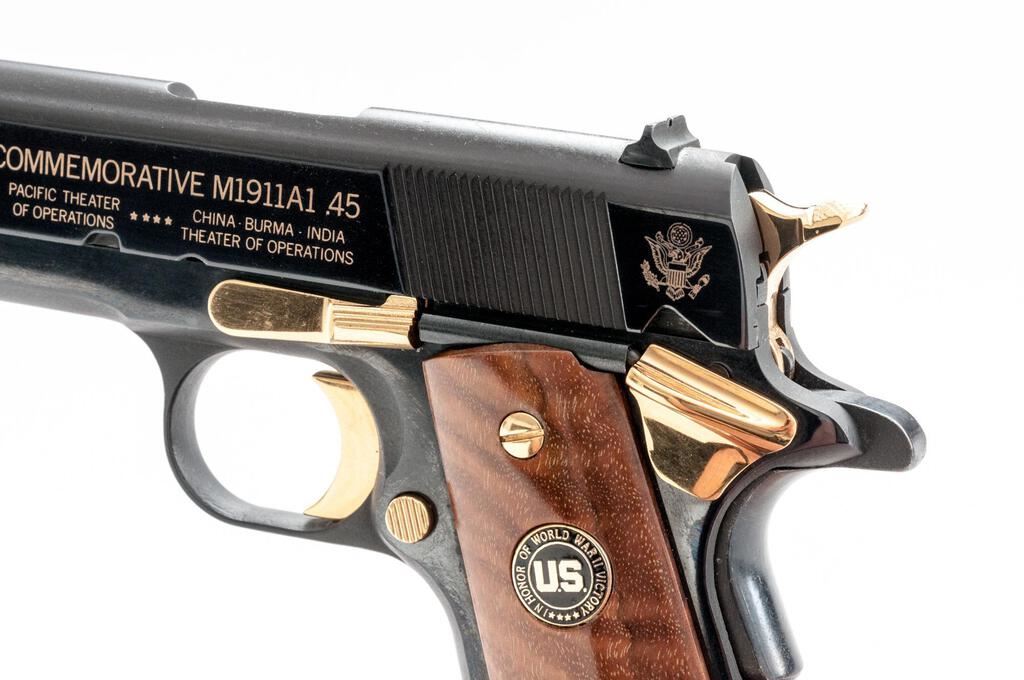 Auto-Ordnance M1911A1 WWII Commemorative Semi-Automatic Pistol, #WW1918, .45 ACP cal., 5" barrel, blade front and fixed rear sights, blue with gold script finish, smooth wood two-piece medallion grips, gold trim on slide stop, manual safety, trigger, hammer and magazine ejector button, lanyard ring, and 7-rd. unmarked magazine. Pistol is in fine overall condition with light scratches, mars, and handling marks. Slide lists in inlaid gold script the WWII Theaters of Operation, with a sharp Ordnance eagle at rear of slide. Smooth wood medallion grips are very good. Action is crisp, bore is good. Est.: $600-$800. (Modern) (Not available to Calif. residents.)