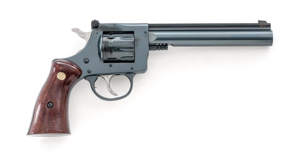Harrington & Richardson Model 904 Double Action 9-Shot Revolver, #AZ006057, .22 LR cal., 6" barrel with a full-length rib, blade front and adjustable rear sights, blue finish, smooth wood two-piece H&R medallion grips, engine-turned trigger and hammer. Mfg'd 1980-1985. Revolver is in excellent overall condition showing little use, retaining approx. 98%-99% factory finish with light handling marks. Grips are near excellent with small mars. Action is crisp, bore is very good. Est.: $250-$400. (Modern/PPT)
