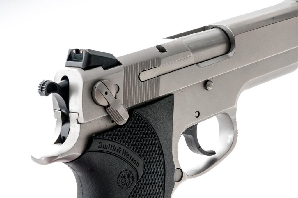 Smith & Wesson Model 4566 DA/SA Semi-Automatic Pistol, #EKZ 5824, .45 ACP cal., 4.25" barrel with three-dot sighting system, stainless steel, checkered rubber S&W marked grips, ambidextrous safety, and two (2) 8-shot magazines, one marked Pro-Mag and the other S&W. Pistol is in near excellent overall condition with light scratches and handling marks, showing little use. Checkered rubber S&W grips are very good. Action is crisp, bore is very good with well-defined rifling. Est.: $500-$700. (Modern/PPT)