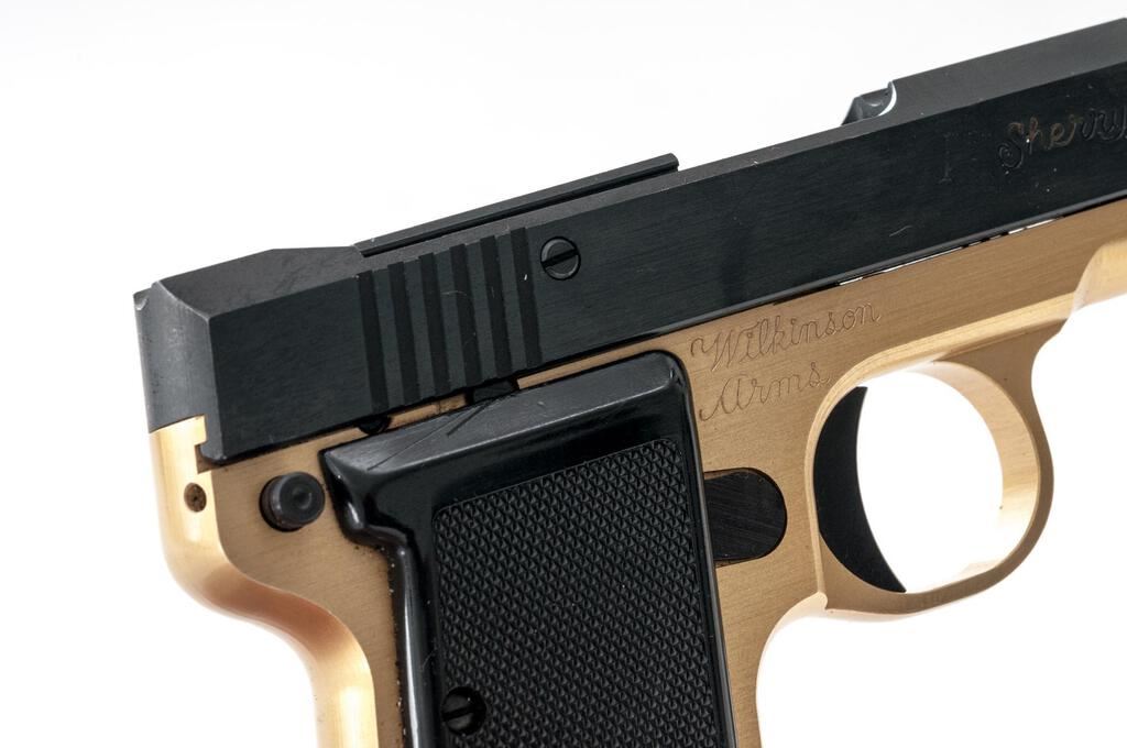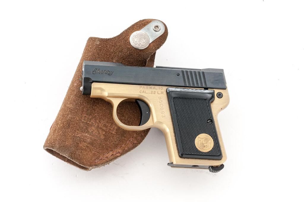 Wilkinson Arms Sherry Model Semi-Automatic Pistol, #850693, .22 LR cal., 2.5" barrel, protected blade front and fixed rear sights, blued machined steel slide, gold anodized aluminum frame, checkered plastic two-piece medallion grips, and one unmarked 8-rd. magazine. Includes a Bianchi 6X suede IWB top snap holster. Gun mfg'd 2000-2005. Pistol is in near excellent overall condition showing little use and only light handling marks. Grips are near excellent as well. Action is crisp, bore is very good. Est.: $300-$500. (Modern/PPT)