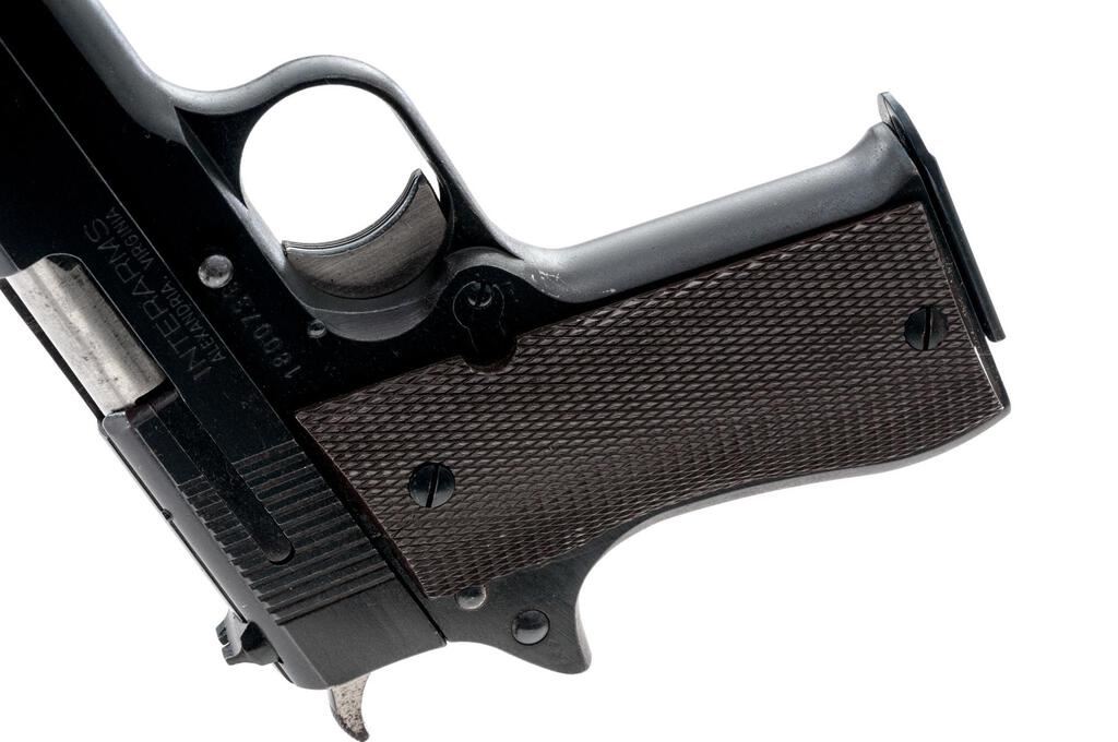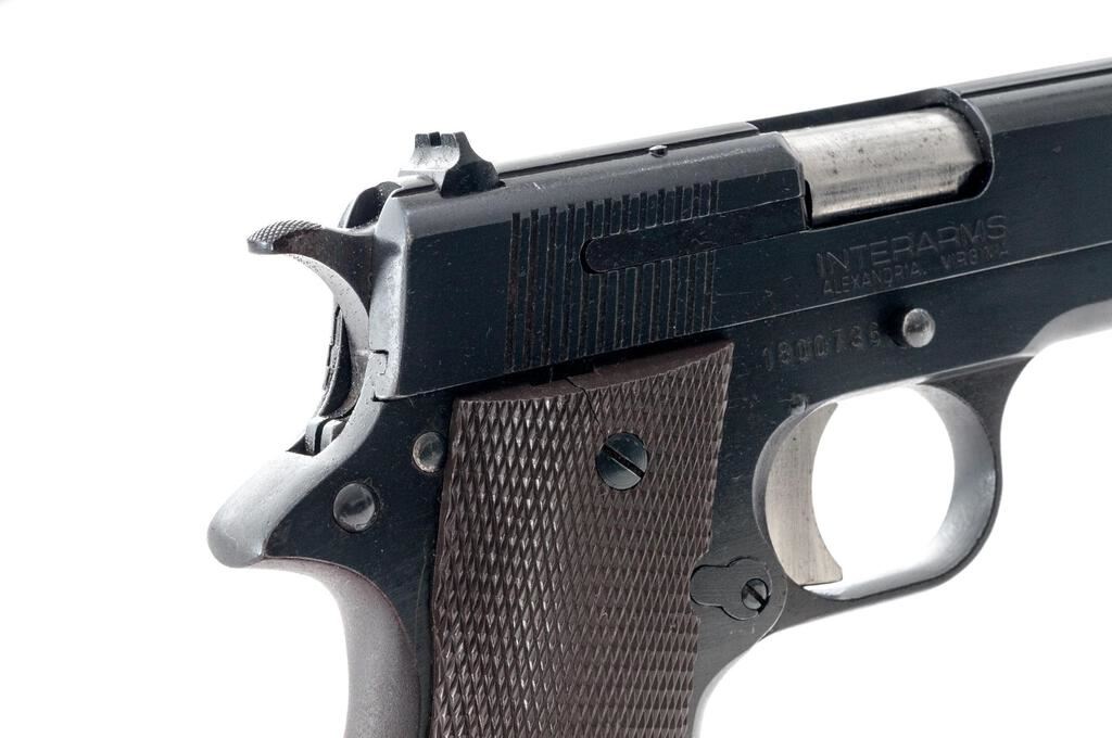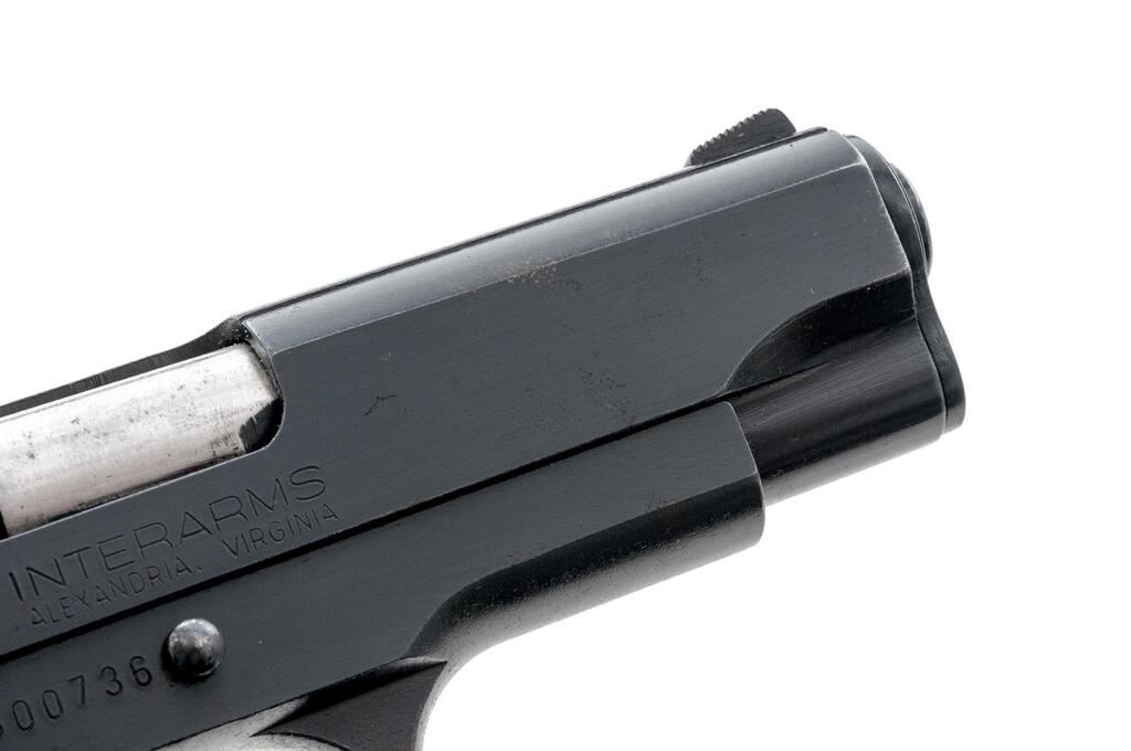 Star Model BM Semi-Automatic Pistol, #1800736, 9mm, 3.9" barrel, serrated blade front and square-notched fixed rear sights, spur hammer, blue finish, checkered plastic two-piece grips, 8-rd. detachable magazine. Right side of slide is import marked "INTERARMS/ALEXANDRIA, VIRGINIA". Mfg'd from 1972-1992. Pistol is in fine overall condition retaining approx. 95%-96% factory finish with light handling and storage marks. There is one small spot of light surface erosion on the left side of the slide near the muzzle. Checkered plastic grips are very good and fit well. Action is crisp, bore is very good. Est.: $300-$400. (Modern/PPT)